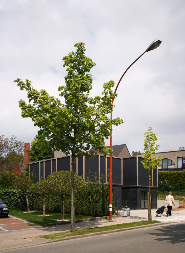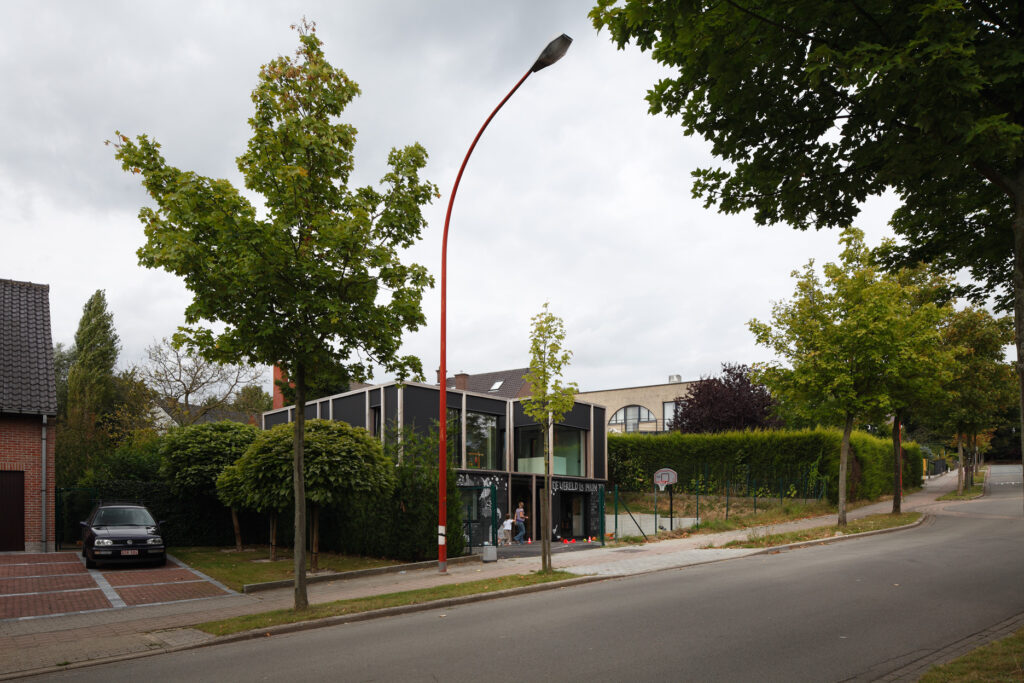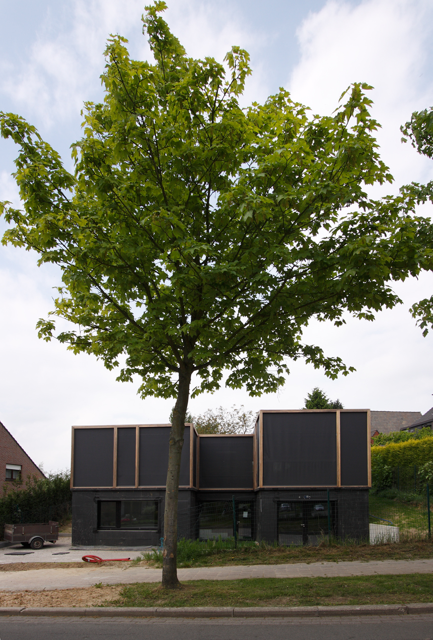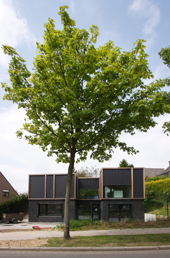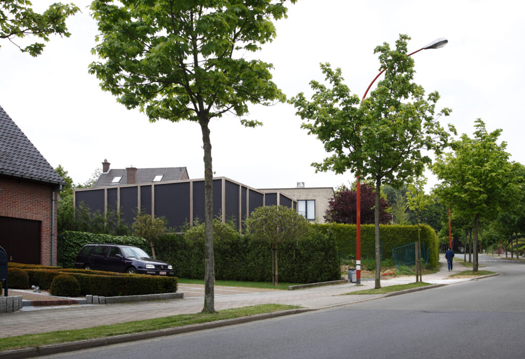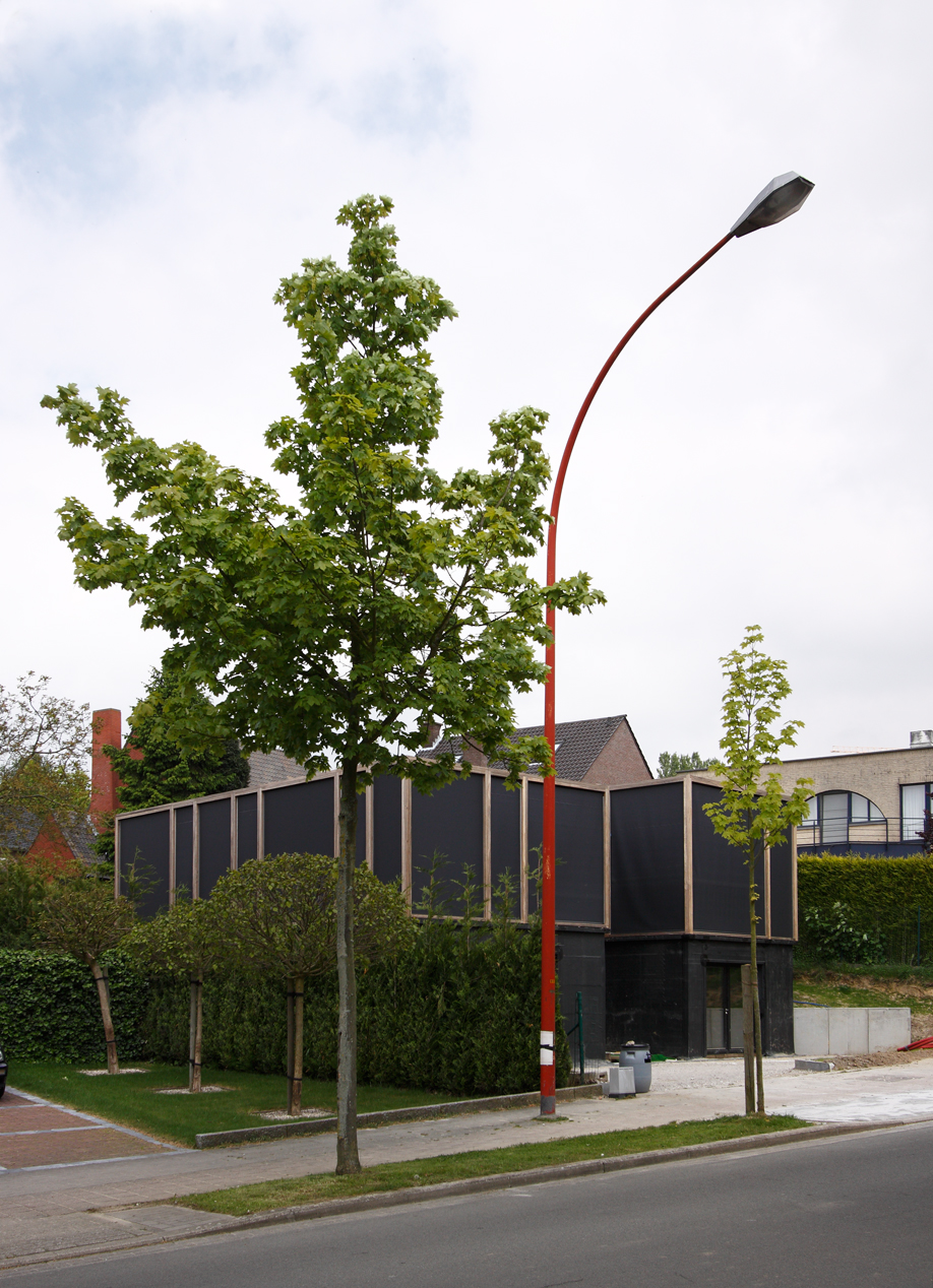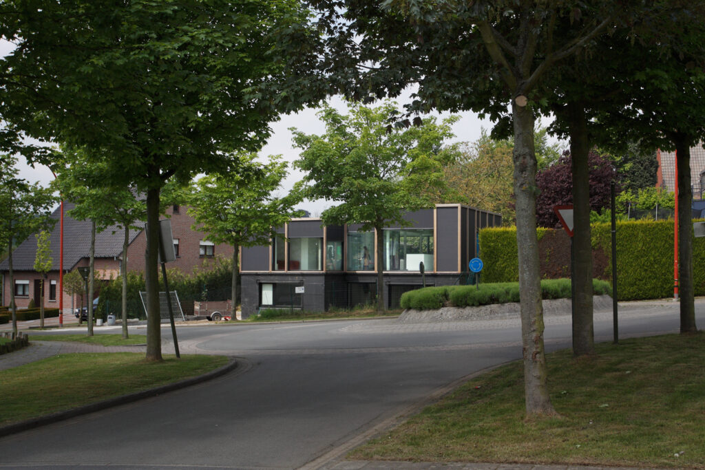 Asse, een gemeente met alle nodige voorzieningen in de Brusselse rand is voor veel gezinnen een aantrekkelijke woonlocatie. Door het ontbreken van stedelijkheid kwam de opdrachtgever terecht op een vrij gebleven en met de tijd -op de straatzijde na- volledig ingesloten perceel in een verkaveling uit de jaren ’60. De stedenbouwkundige contouren van deze verkaveling, met vrijstaande en weinig compacte bebouwing en met inefficiënt grondgebruik staan in zekere zin lijnrecht tegenover de duurzame gedachte. Door al deze elementen werd het bouwen van een passiefhuis op deze locatie een bewuste en verantwoorde keuze. De woning negeert de de vastgeroeste logica van de verkaveling door haar inplanting en relatie met de straat. De voortuin die per definitie ontstaat wanneer de voorbouwlijn van de overige bebouwing in de straat wordt aangehouden werd niet geprivatiseerd door middel van hagen of hekken, maar ingericht als een interactieve zone tussen de woning en de straat. Het verhard vlak dat aansluiting zoekt met het statuut van de straat en het voetpad kan met eenvoudige middelen zoals krijt en enkele speeltuigen worden ingericht als speelplaats voor de kinderen uit de buurt.