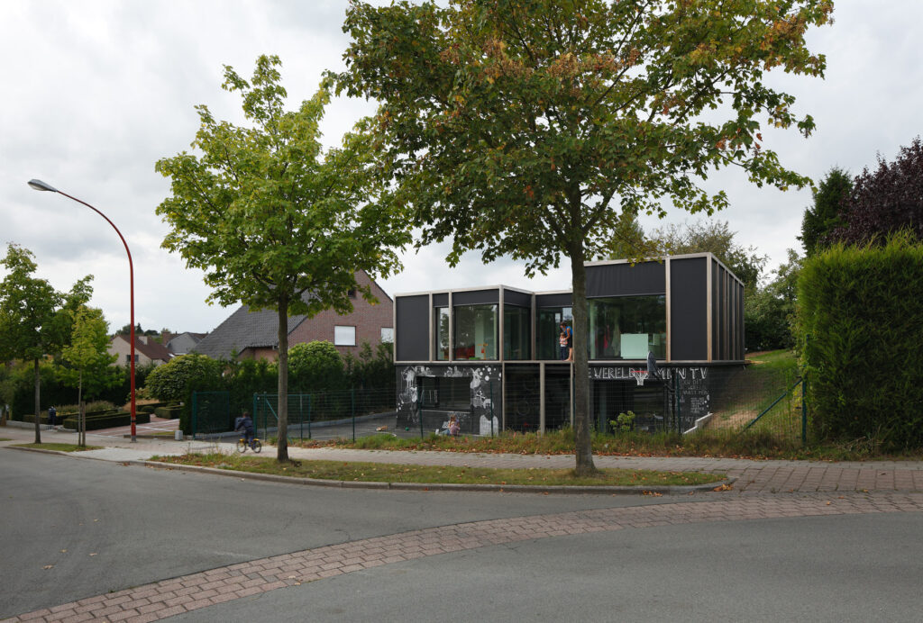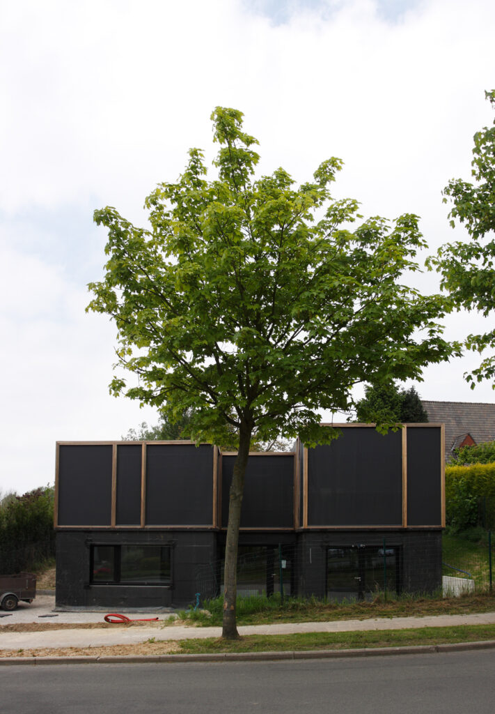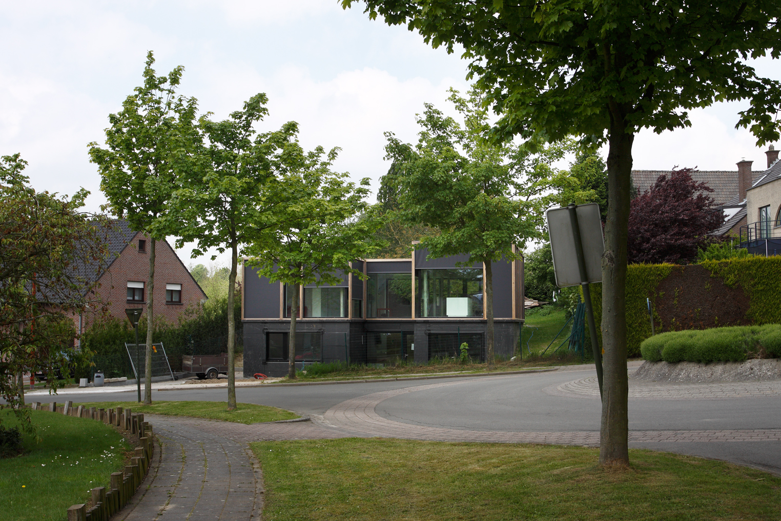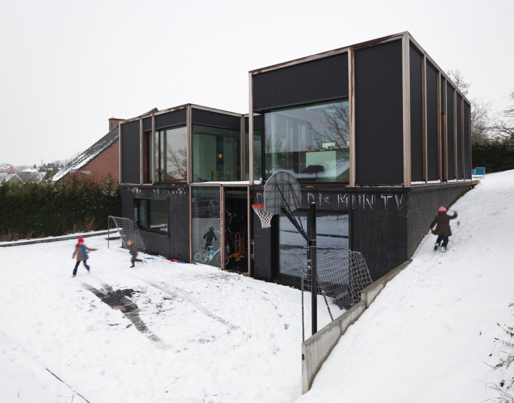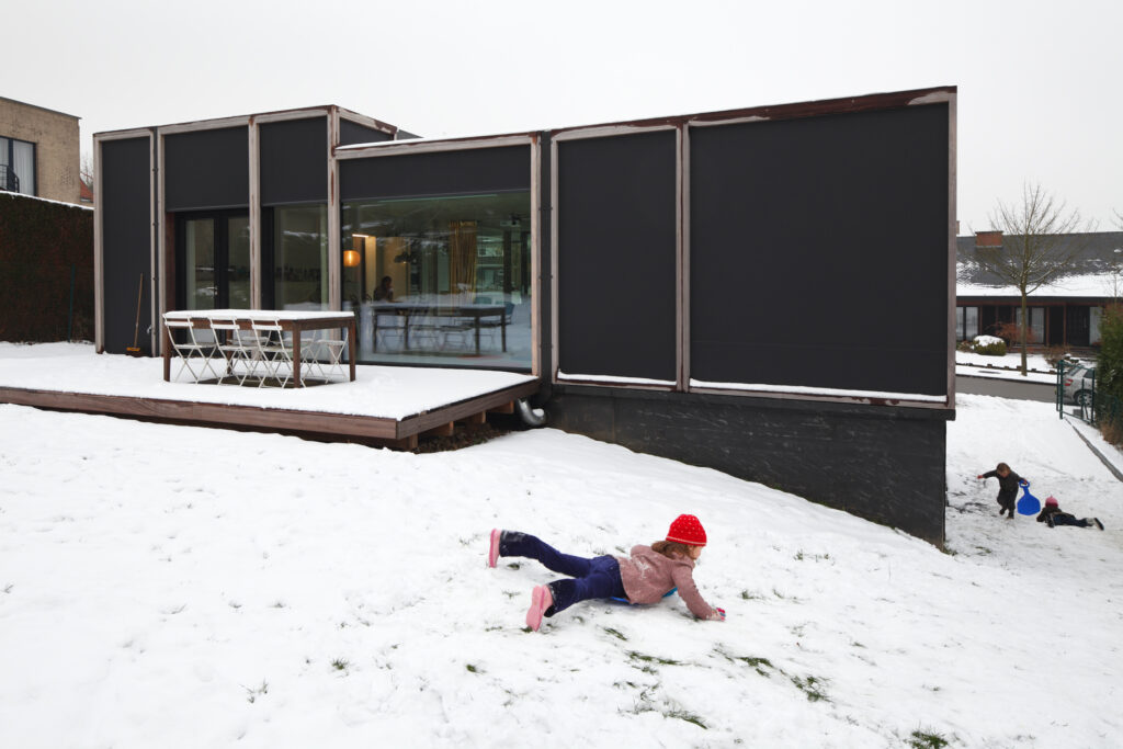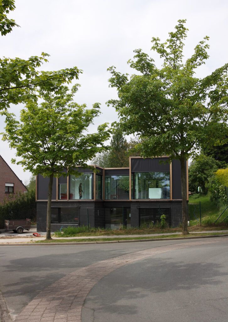 Asse, een gemeente met alle nodige voorzieningen in de Brusselse rand is voor veel gezinnen een aantrekkelijke woonlocatie. Door het ontbreken van stedelijkheid kwam de opdrachtgever terecht op een vrij gebleven en met de tijd -op de straatzijde na- volledig ingesloten perceel in een verkaveling uit de jaren ’60. De stedenbouwkundige contouren van deze verkaveling, met vrijstaande en weinig compacte bebouwing en met inefficiënt grondgebruik staan in zekere zin lijnrecht tegenover de duurzame gedachte. Door al deze elementen werd het bouwen van een passiefhuis op deze locatie een bewuste en verantwoorde keuze. De woning negeert de de vastgeroeste logica van de verkaveling door haar inplanting en relatie met de straat. De voortuin die per definitie ontstaat wanneer de voorbouwlijn van de overige bebouwing in de straat wordt aangehouden werd niet geprivatiseerd door middel van hagen of hekken, maar ingericht als een interactieve zone tussen de woning en de straat. Het verhard vlak dat aansluiting zoekt met het statuut van de straat en het voetpad kan met eenvoudige middelen zoals krijt en enkele speeltuigen worden ingericht als speelplaats voor de kinderen uit de buurt.