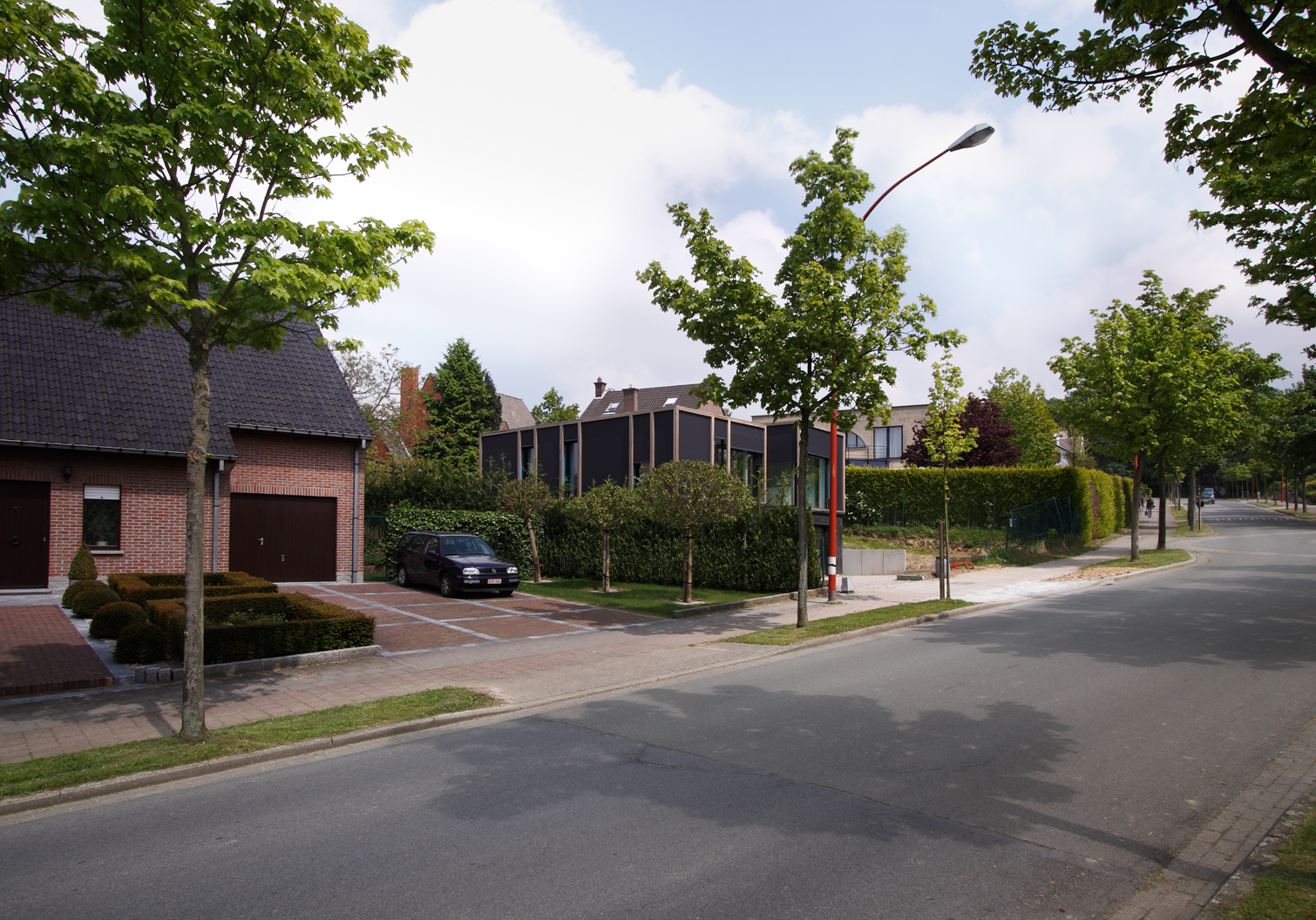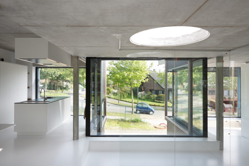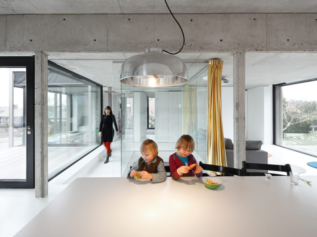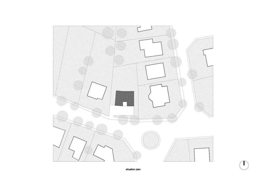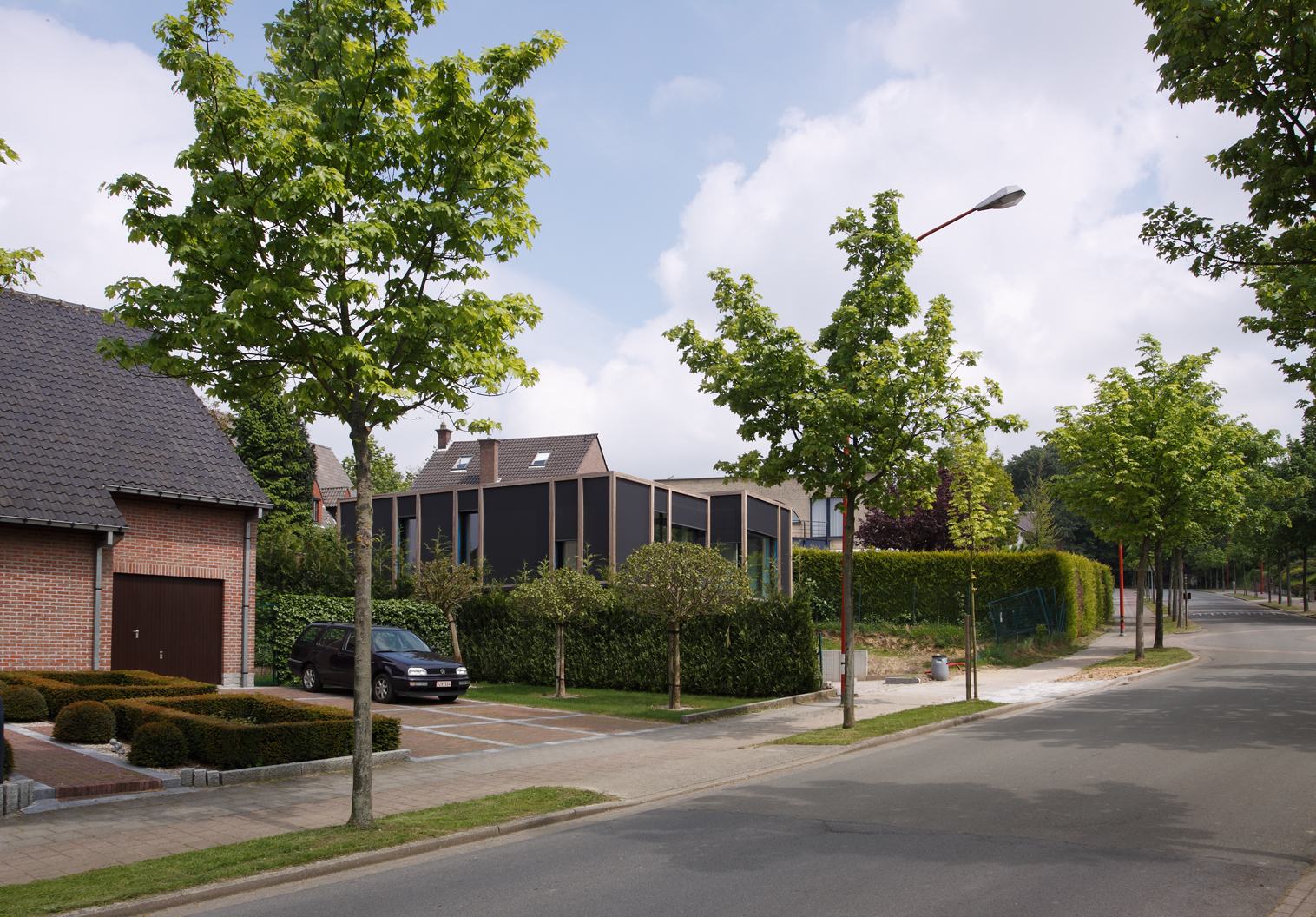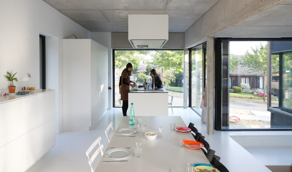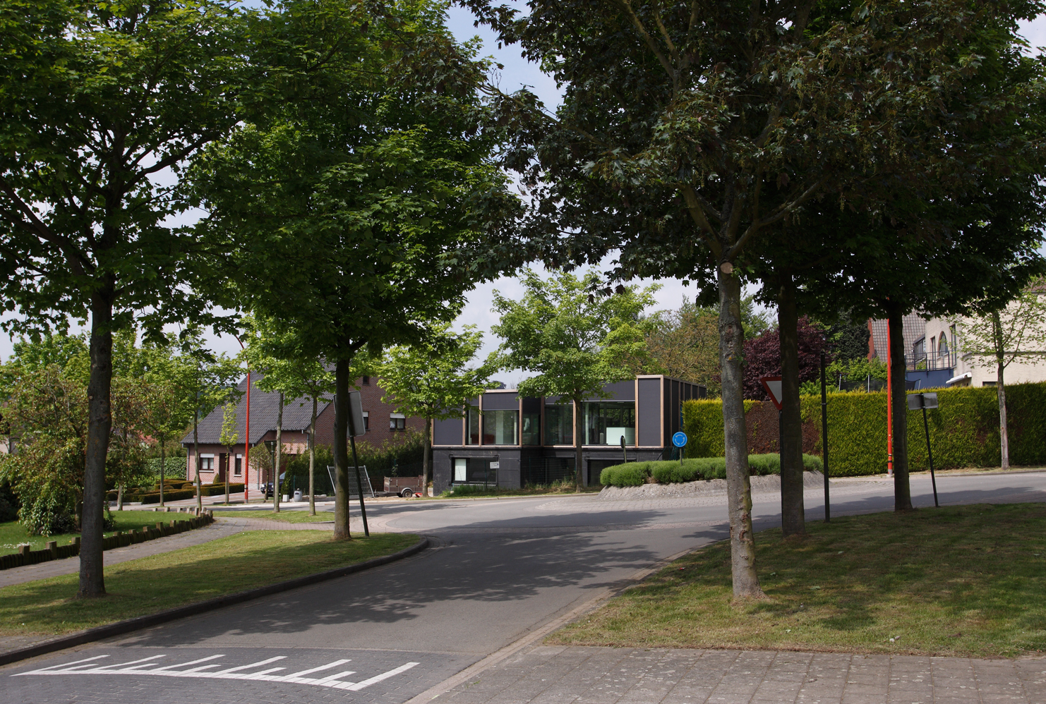 Asse, een gemeente met alle nodige voorzieningen in de Brusselse rand is voor veel gezinnen een aantrekkelijke woonlocatie. Door het ontbreken van stedelijkheid kwam de opdrachtgever terecht op een vrij gebleven en met de tijd -op de straatzijde na- volledig ingesloten perceel in een verkaveling uit de jaren ’60. De stedenbouwkundige contouren van deze verkaveling, met vrijstaande en weinig compacte bebouwing en met inefficiënt grondgebruik staan in zekere zin lijnrecht tegenover de duurzame gedachte. Door al deze elementen werd het bouwen van een passiefhuis op deze locatie een bewuste en verantwoorde keuze. De woning negeert de de vastgeroeste logica van de verkaveling door haar inplanting en relatie met de straat. De voortuin die per definitie ontstaat wanneer de voorbouwlijn van de overige bebouwing in de straat wordt aangehouden werd niet geprivatiseerd door middel van hagen of hekken, maar ingericht als een interactieve zone tussen de woning en de straat. Het verhard vlak dat aansluiting zoekt met het statuut van de straat en het voetpad kan met eenvoudige middelen zoals krijt en enkele speeltuigen worden ingericht als speelplaats voor de kinderen uit de buurt.