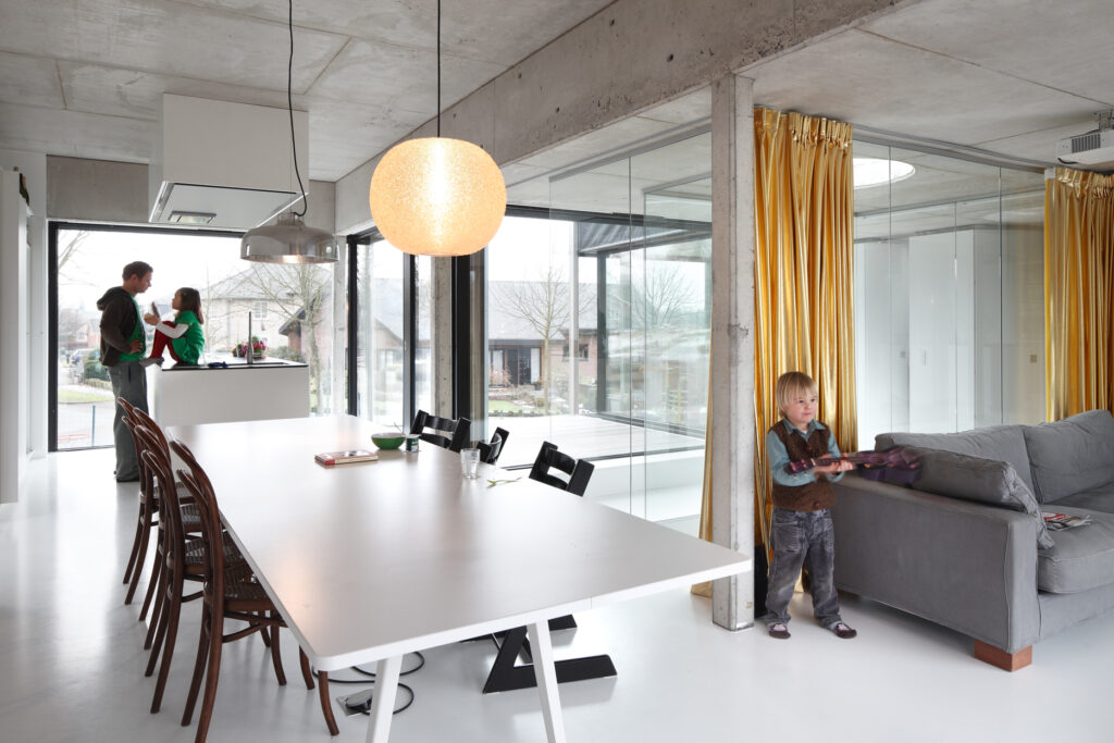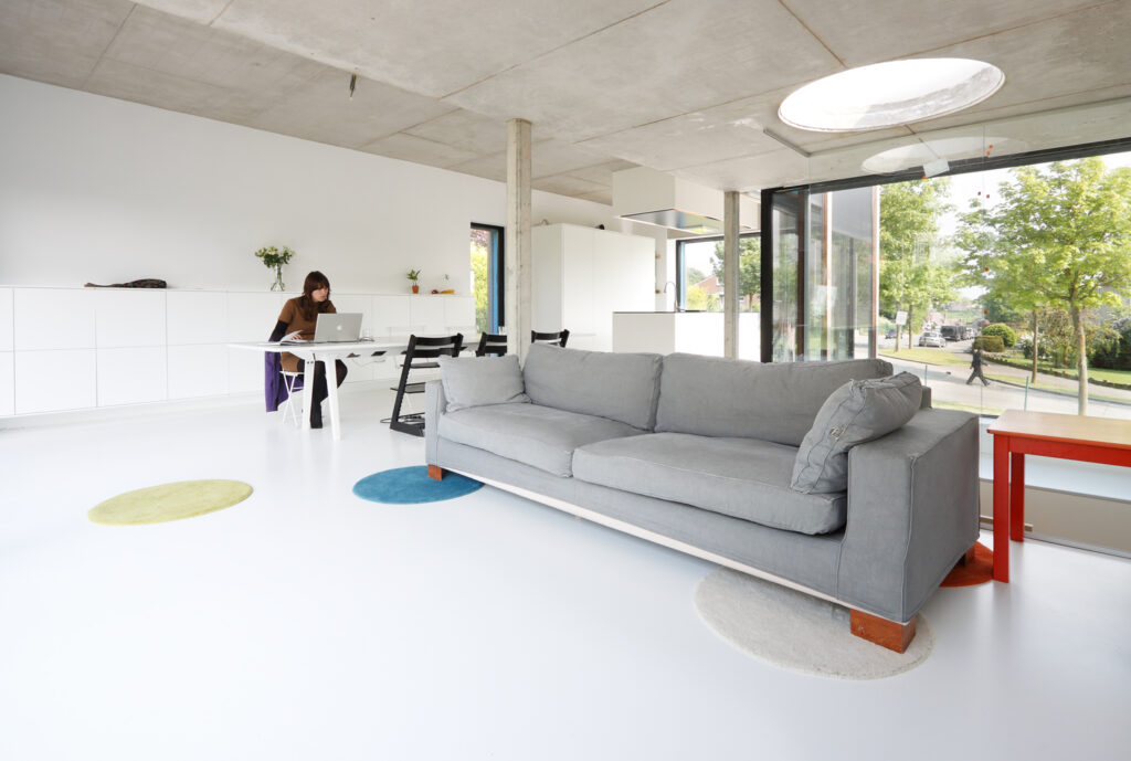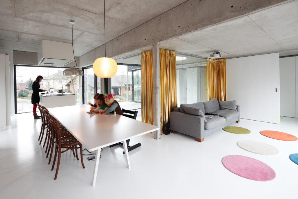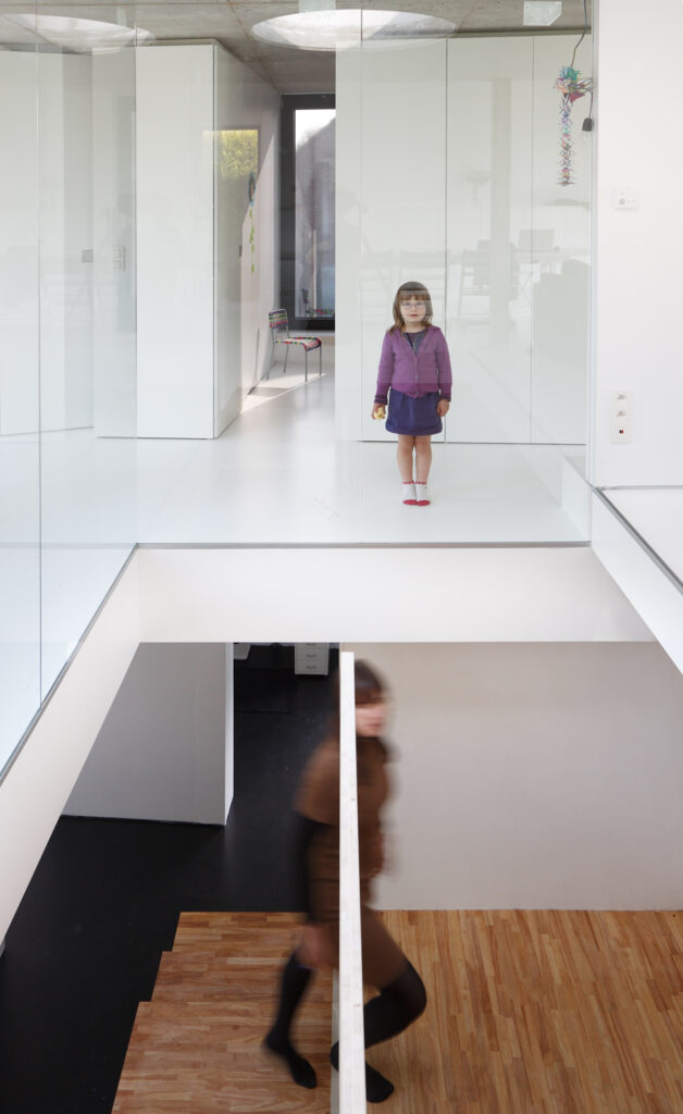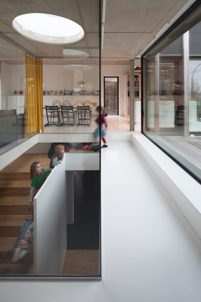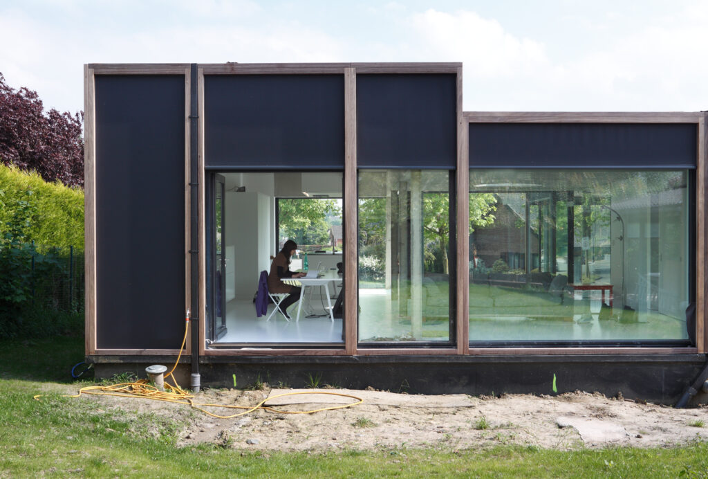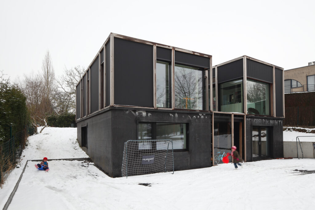 Asse, een gemeente met alle nodige voorzieningen in de Brusselse rand is voor veel gezinnen een aantrekkelijke woonlocatie. Door het ontbreken van stedelijkheid kwam de opdrachtgever terecht op een vrij gebleven en met de tijd -op de straatzijde na- volledig ingesloten perceel in een verkaveling uit de jaren ’60. De stedenbouwkundige contouren van deze verkaveling, met vrijstaande en weinig compacte bebouwing en met inefficiënt grondgebruik staan in zekere zin lijnrecht tegenover de duurzame gedachte. Door al deze elementen werd het bouwen van een passiefhuis op deze locatie een bewuste en verantwoorde keuze. De woning negeert de de vastgeroeste logica van de verkaveling door haar inplanting en relatie met de straat. De voortuin die per definitie ontstaat wanneer de voorbouwlijn van de overige bebouwing in de straat wordt aangehouden werd niet geprivatiseerd door middel van hagen of hekken, maar ingericht als een interactieve zone tussen de woning en de straat. Het verhard vlak dat aansluiting zoekt met het statuut van de straat en het voetpad kan met eenvoudige middelen zoals krijt en enkele speeltuigen worden ingericht als speelplaats voor de kinderen uit de buurt.