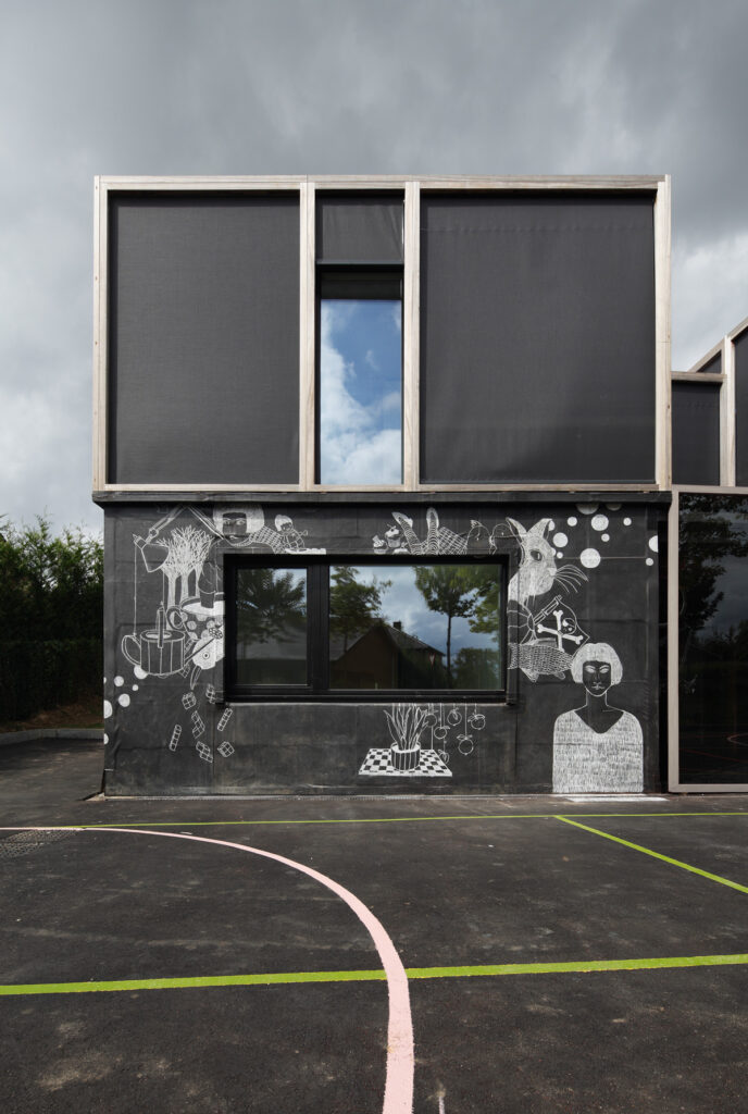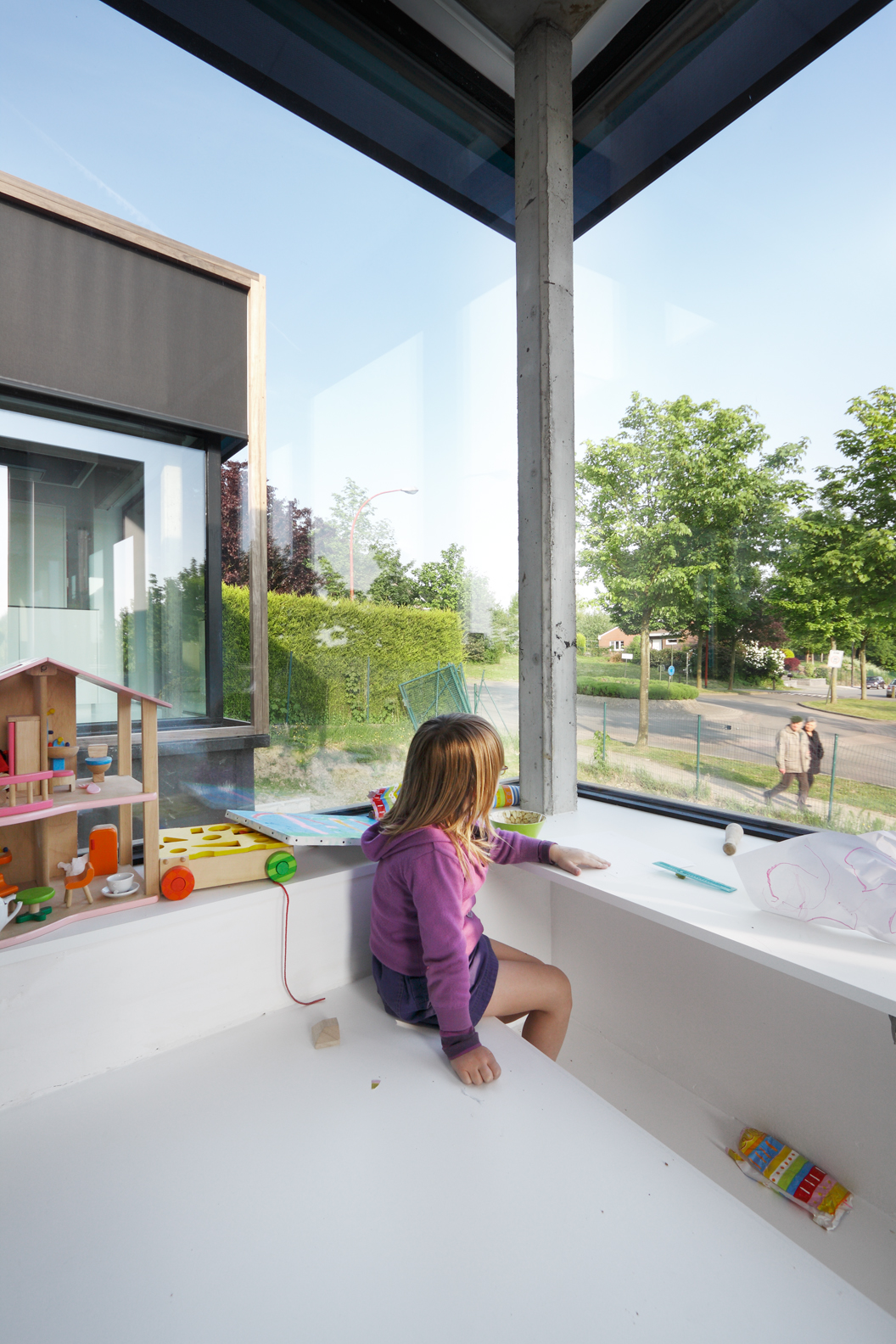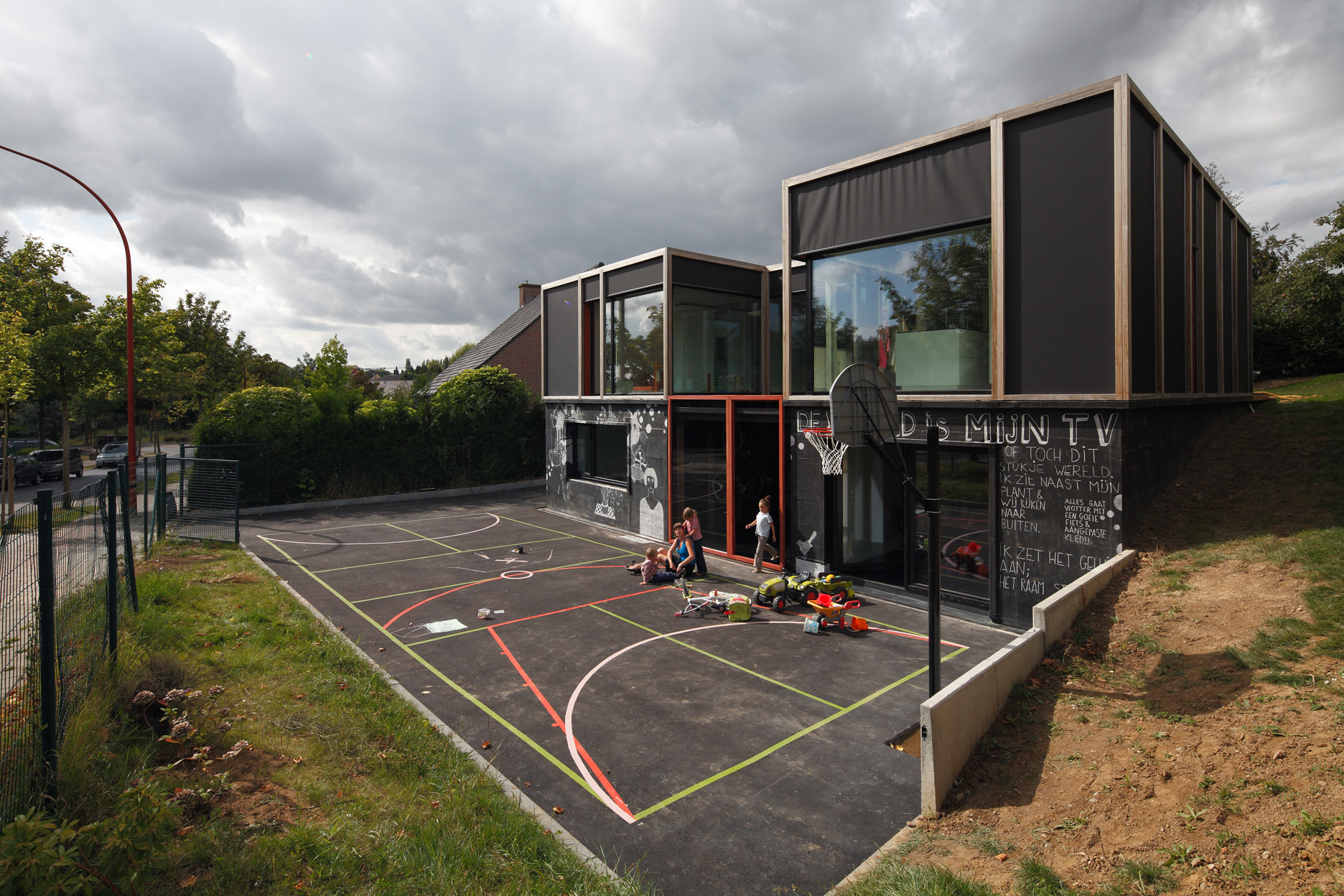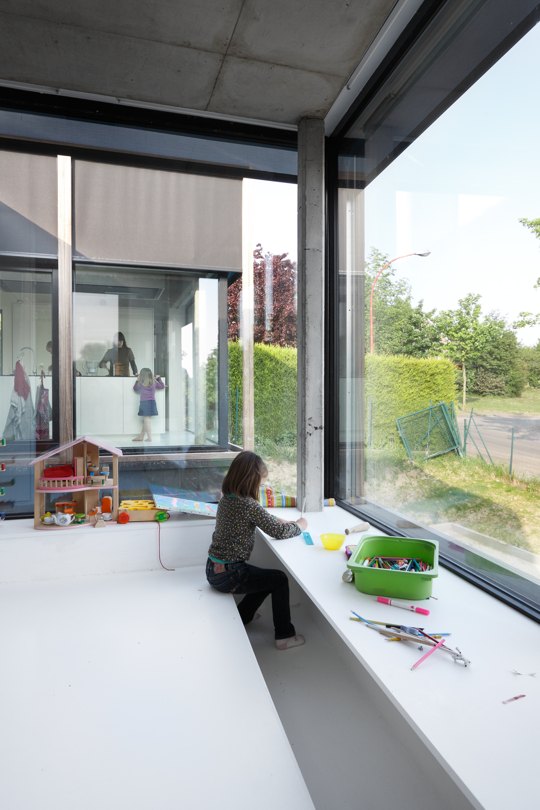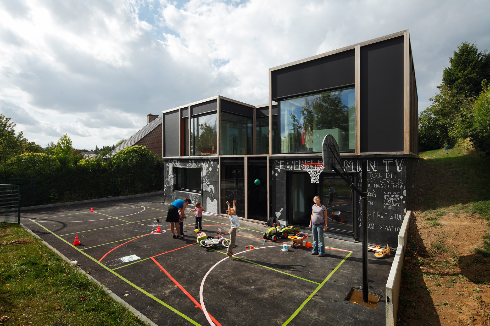 Asse, een gemeente met alle nodige voorzieningen in de Brusselse rand is voor veel gezinnen een aantrekkelijke woonlocatie. Door het ontbreken van stedelijkheid kwam de opdrachtgever terecht op een vrij gebleven en met de tijd -op de straatzijde na- volledig ingesloten perceel in een verkaveling uit de jaren ’60. De stedenbouwkundige contouren van deze verkaveling, met vrijstaande en weinig compacte bebouwing en met inefficiënt grondgebruik staan in zekere zin lijnrecht tegenover de duurzame gedachte. Door al deze elementen werd het bouwen van een passiefhuis op deze locatie een bewuste en verantwoorde keuze. De woning negeert de de vastgeroeste logica van de verkaveling door haar inplanting en relatie met de straat. De voortuin die per definitie ontstaat wanneer de voorbouwlijn van de overige bebouwing in de straat wordt aangehouden werd niet geprivatiseerd door middel van hagen of hekken, maar ingericht als een interactieve zone tussen de woning en de straat. Het verhard vlak dat aansluiting zoekt met het statuut van de straat en het voetpad kan met eenvoudige middelen zoals krijt en enkele speeltuigen worden ingericht als speelplaats voor de kinderen uit de buurt.