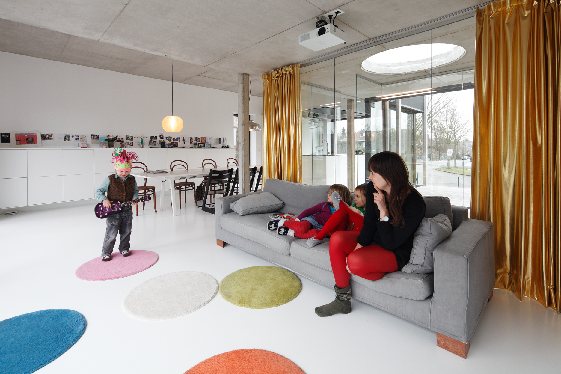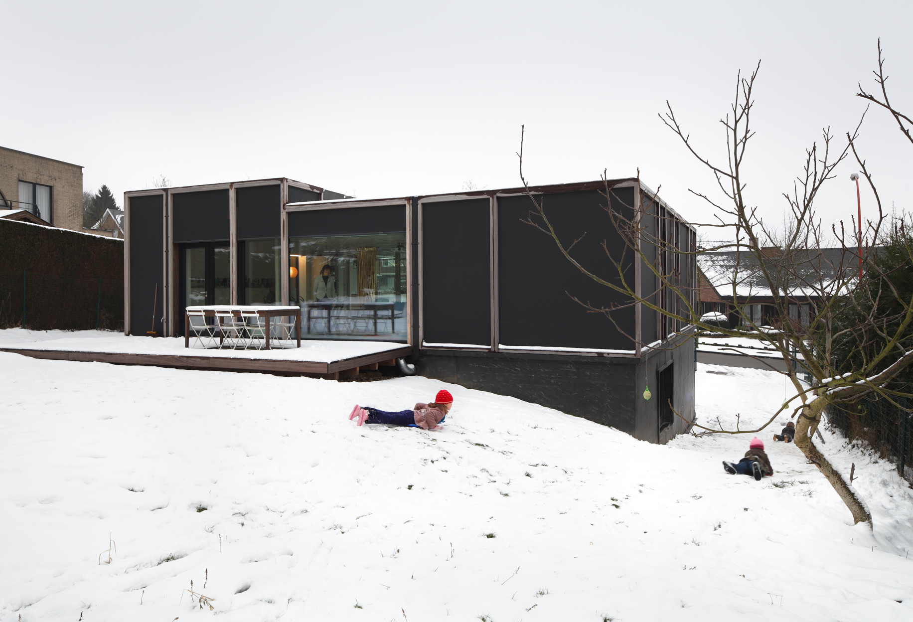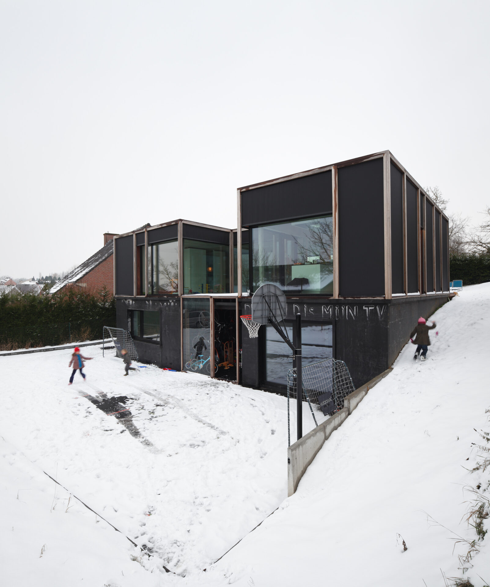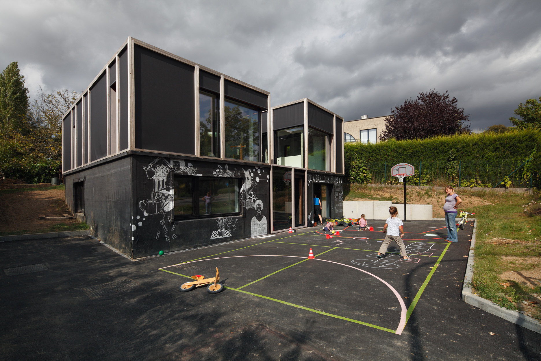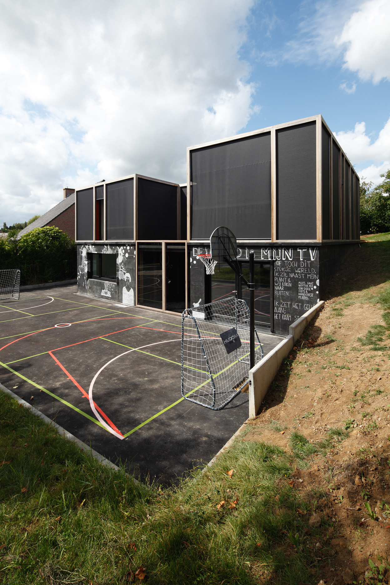 Asse, een gemeente met alle nodige voorzieningen in de Brusselse rand is voor veel gezinnen een aantrekkelijke woonlocatie. Door het ontbreken van stedelijkheid kwam de opdrachtgever terecht op een vrij gebleven en met de tijd -op de straatzijde na- volledig ingesloten perceel in een verkaveling uit de jaren ’60. De stedenbouwkundige contouren van deze verkaveling, met vrijstaande en weinig compacte bebouwing en met inefficiënt grondgebruik staan in zekere zin lijnrecht tegenover de duurzame gedachte. Door al deze elementen werd het bouwen van een passiefhuis op deze locatie een bewuste en verantwoorde keuze. De woning negeert de de vastgeroeste logica van de verkaveling door haar inplanting en relatie met de straat. De voortuin die per definitie ontstaat wanneer de voorbouwlijn van de overige bebouwing in de straat wordt aangehouden werd niet geprivatiseerd door middel van hagen of hekken, maar ingericht als een interactieve zone tussen de woning en de straat. Het verhard vlak dat aansluiting zoekt met het statuut van de straat en het voetpad kan met eenvoudige middelen zoals krijt en enkele speeltuigen worden ingericht als speelplaats voor de kinderen uit de buurt.