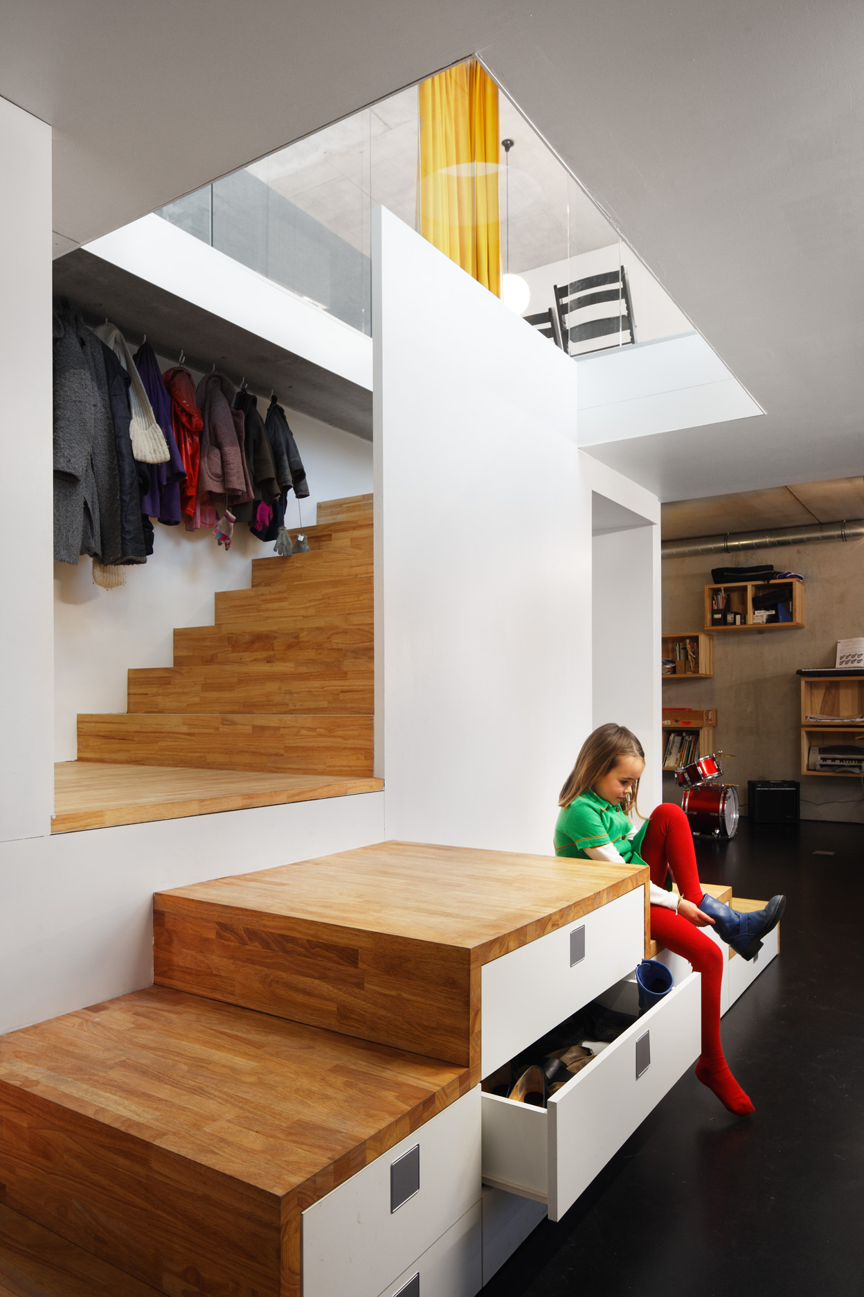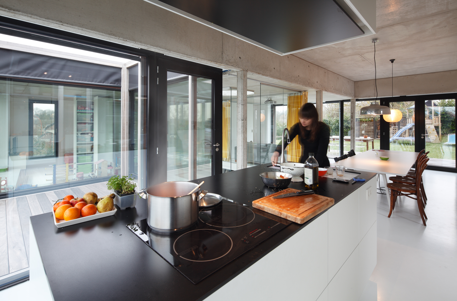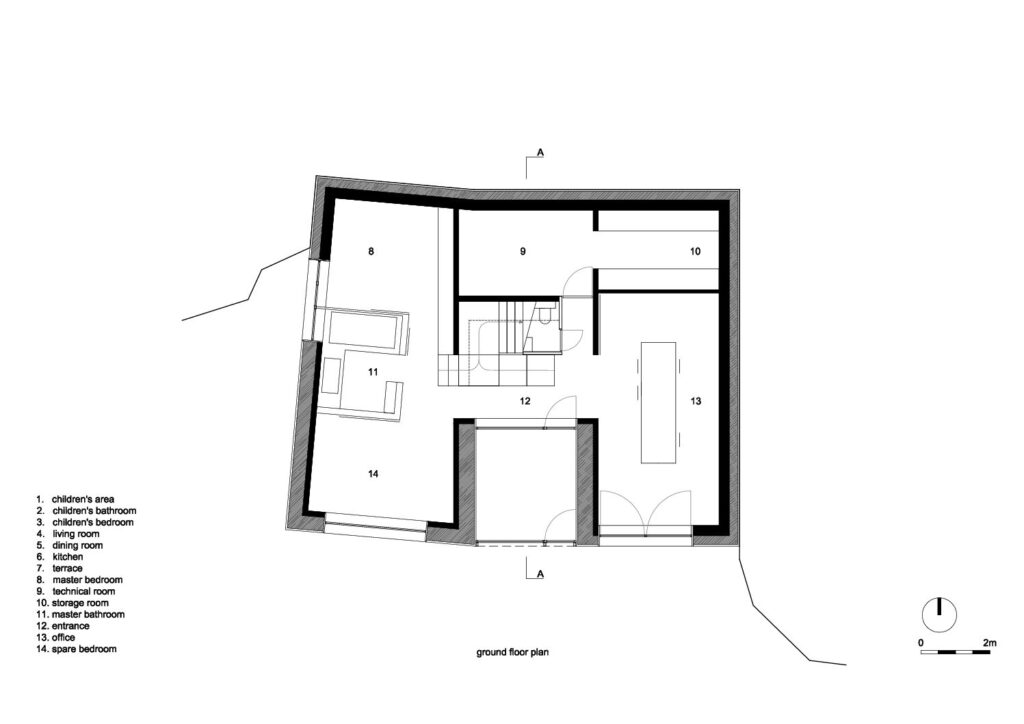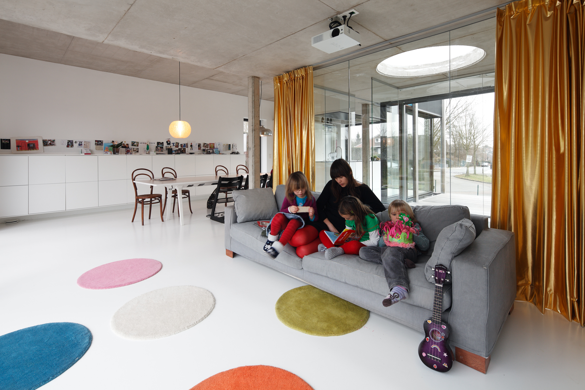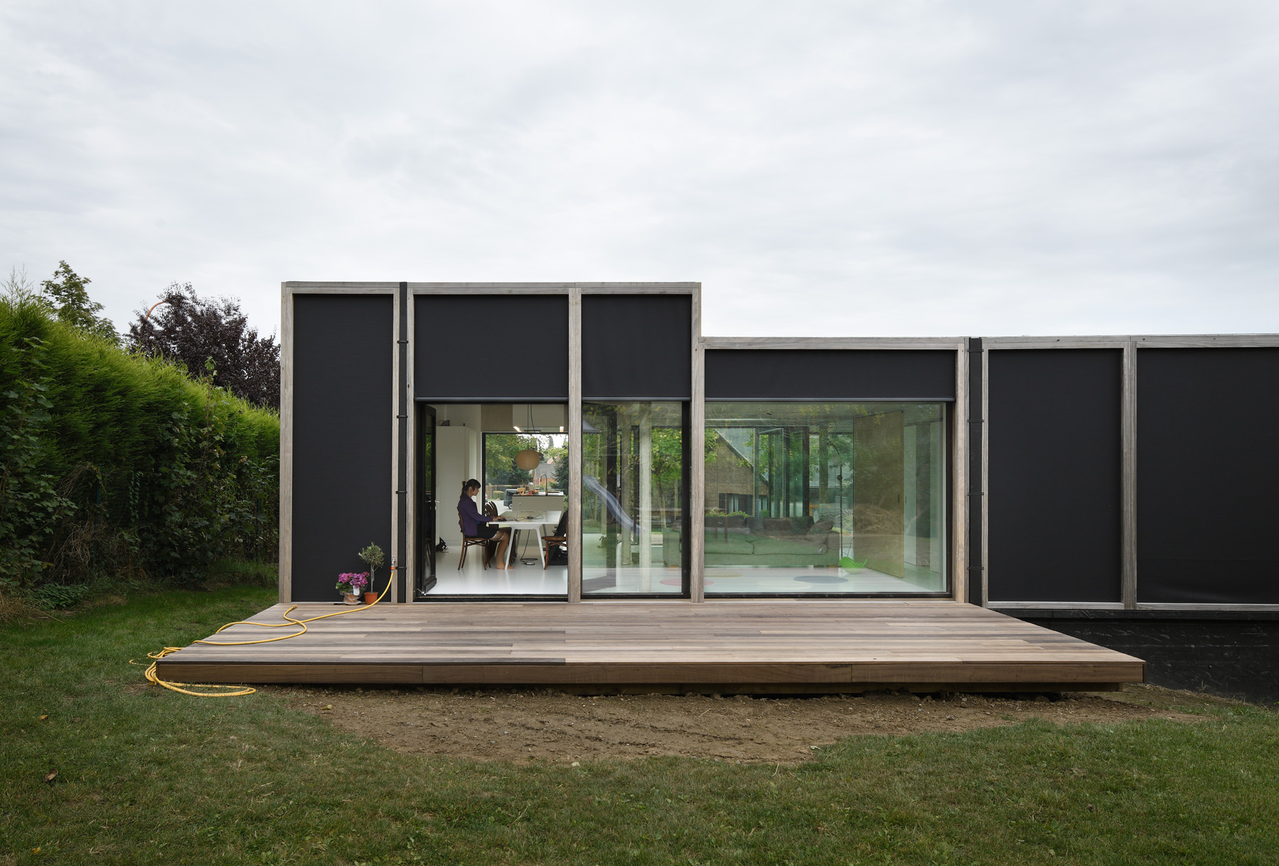 Asse, een gemeente met alle nodige voorzieningen in de Brusselse rand is voor veel gezinnen een aantrekkelijke woonlocatie. Door het ontbreken van stedelijkheid kwam de opdrachtgever terecht op een vrij gebleven en met de tijd -op de straatzijde na- volledig ingesloten perceel in een verkaveling uit de jaren ’60. De stedenbouwkundige contouren van deze verkaveling, met vrijstaande en weinig compacte bebouwing en met inefficiënt grondgebruik staan in zekere zin lijnrecht tegenover de duurzame gedachte. Door al deze elementen werd het bouwen van een passiefhuis op deze locatie een bewuste en verantwoorde keuze. De woning negeert de de vastgeroeste logica van de verkaveling door haar inplanting en relatie met de straat. De voortuin die per definitie ontstaat wanneer de voorbouwlijn van de overige bebouwing in de straat wordt aangehouden werd niet geprivatiseerd door middel van hagen of hekken, maar ingericht als een interactieve zone tussen de woning en de straat. Het verhard vlak dat aansluiting zoekt met het statuut van de straat en het voetpad kan met eenvoudige middelen zoals krijt en enkele speeltuigen worden ingericht als speelplaats voor de kinderen uit de buurt.