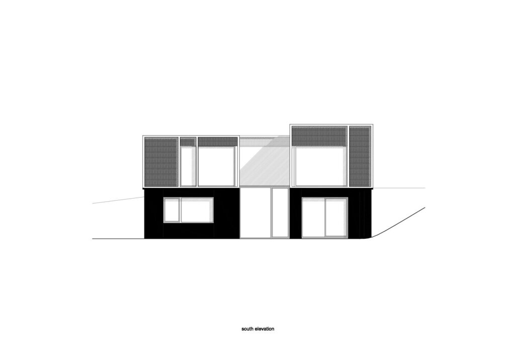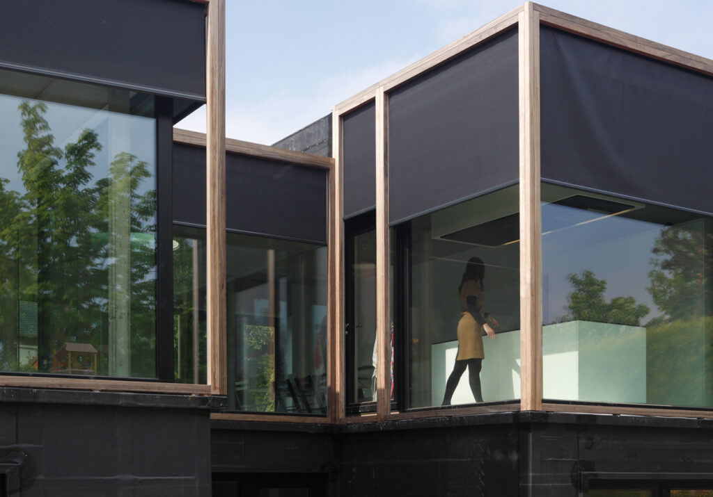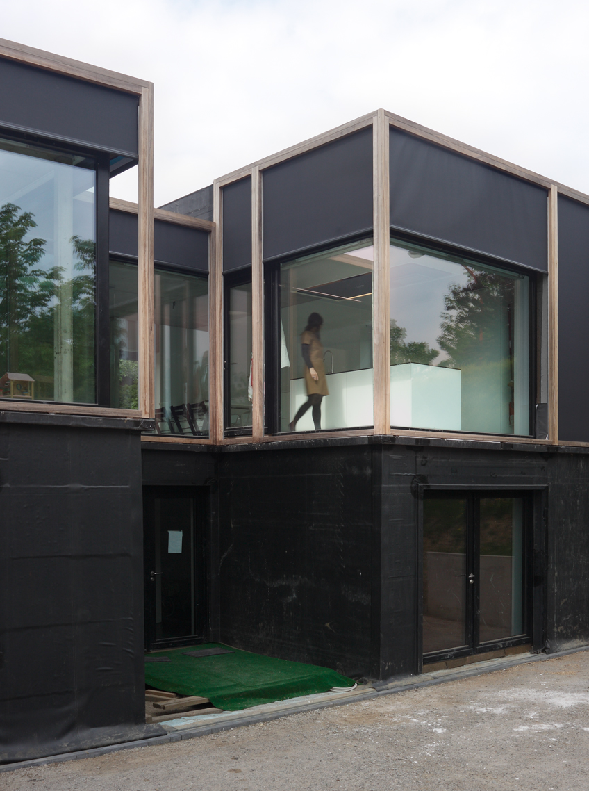 Het bouwterrein voor dit project is hellend en ligt achteraan 2 meter hoger dan voor vooraan. De woning is opgebouwd uit een massieve onderbouw, een ter plaatse gestorte betonkuip die half ingegraven ligt in het talud, en een bovenbouw in houtskelet. Om de zuidoriëntatie, tevens de straatzijde van het perceel, optimaal te kunnen inzetten in het passiefhuisconcept is de leefruimte van de woning op de eerste verdieping voorzien. Zo kan er in de bovenbouw veel glas toegepast worden met het oog op passieve warmtewinning, zonder aan privacy in te boeten. Bovendien sluiten de leefruimtes hierdoor aan op het niveau van de achtertuin. Het passiefhuisconcept maakt het raumplan-principe heel toepasbaar, het weglaten van binnenmuren en het creëren van vides veroorzaakt geen comfortverlies. Om de dikte van de buitenwanden te beperken worden alternatieven gezocht voor de traditionele gevelsteen. Zo wordt EPDM rubber gebruikt als gevelbekleding voor de benedenverdieping. Voor de gevels van de bovenbouw werd een intelligente huid ontwikkeld, die bestaat uit een repetitieve blokkaderstructuur bekleed met uv-blokkerend glasvezeldoek. Waar nodig kan het doek openen en sluiten, en zo werken als zonwering voor de beglaasde geveldelen. Ter hoogte van de gesloten delen zorgt het doek voor de bescherming van de achtergelegen houtvezelplaten. Dankzij dit gevelsysteem wordt aan alle bouwfysische eisen voldaan en krijgt de bovenbouw, in contrast met de massieve sokkel, een flexibel, transparant en open karakter.