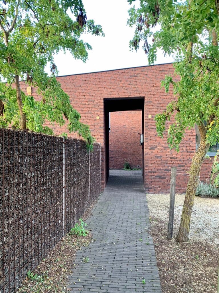 TYPOLOGISCH en MORFOLOGISCH: de wooncluster bestaat hoofdzakelijk uit woningen van 1 bouwlaag met hellend dak en met groene voortuinstroken. Aansluitend op dit gabariet is de voorgevel lager gehouden (1 bouwlaag) en de 2 bouwlagen bevinden zich onder het vlinderdak achteraan, openend naar het uitgestrekte agrarisch gebied.