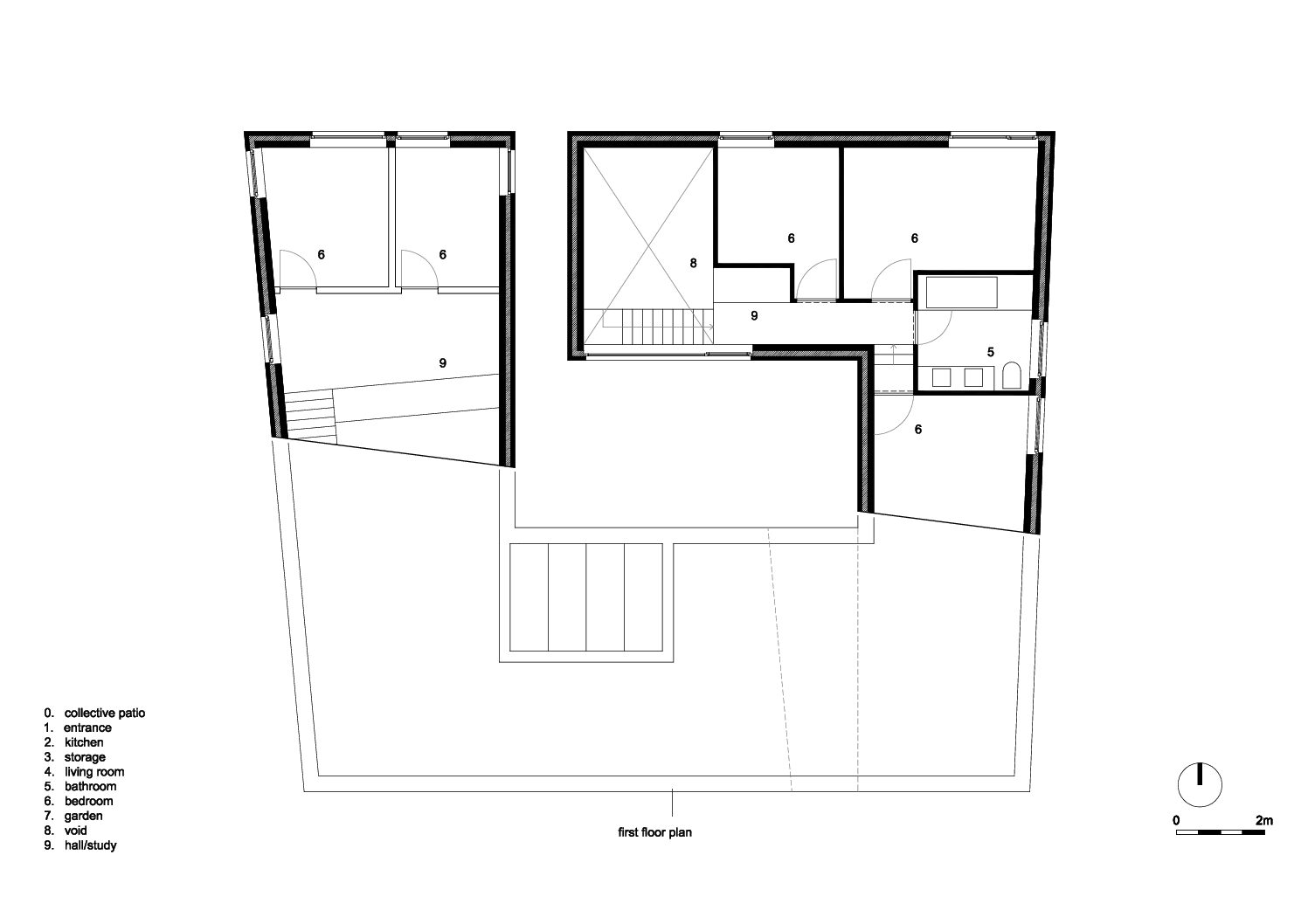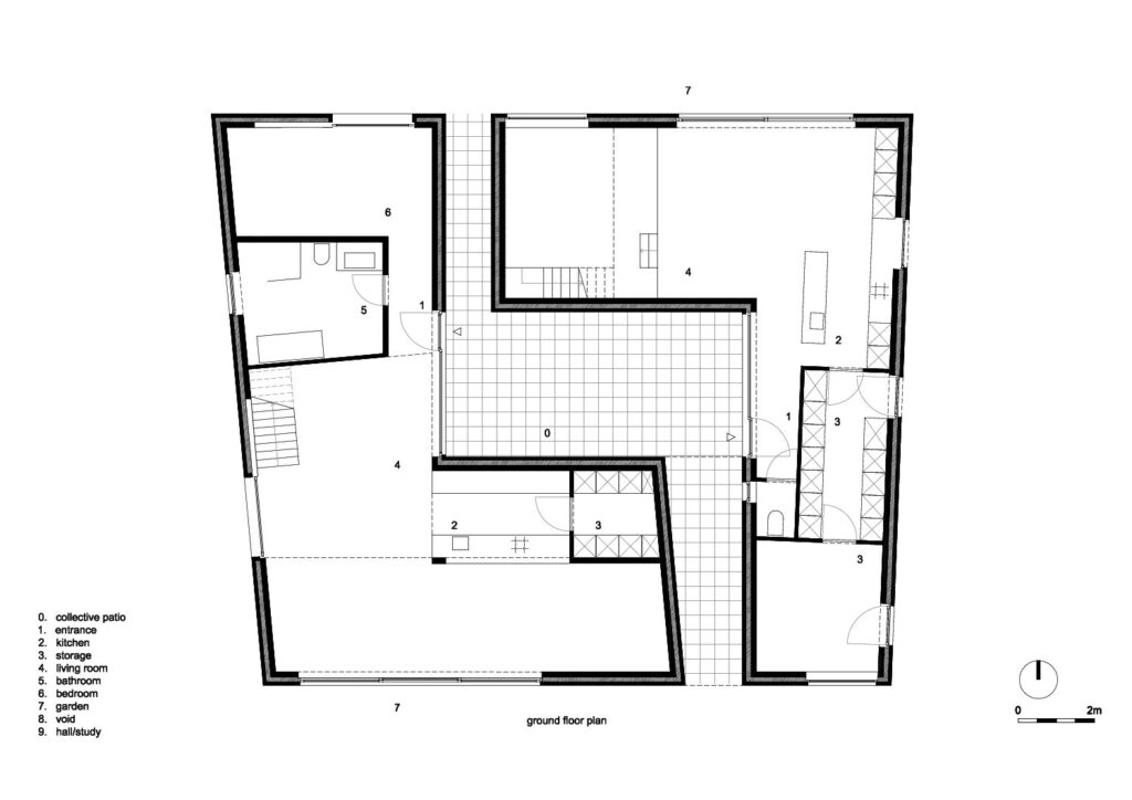 SOCIAAL: het perceel bevindt zich in een wooncluster, een klein wijkje waar de buren elkaar kennen. Er zijn verschillende doorgangen van tuin naar tuin die de sociale contacten bevorderen. Dit gegeven wordt in het ontwerp eveneens gebruikt om doorheen de woningen te kunnen gaan, een patio als ontmoetingsplaats aan de inkom. Het is een zoeken naar een nieuwe woonvorm met een hoge densiteit (koppelwoonst), ruimtelijke en duurzame kwaliteit. Het is een vorm van zorgwonen zoals kangoeroewonen waarin naast de ontmoetingsplaatsen toch strikt private ruimtes ontstaan.