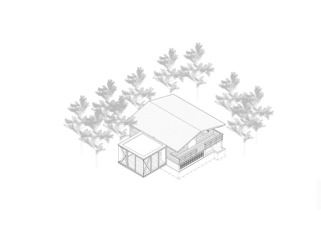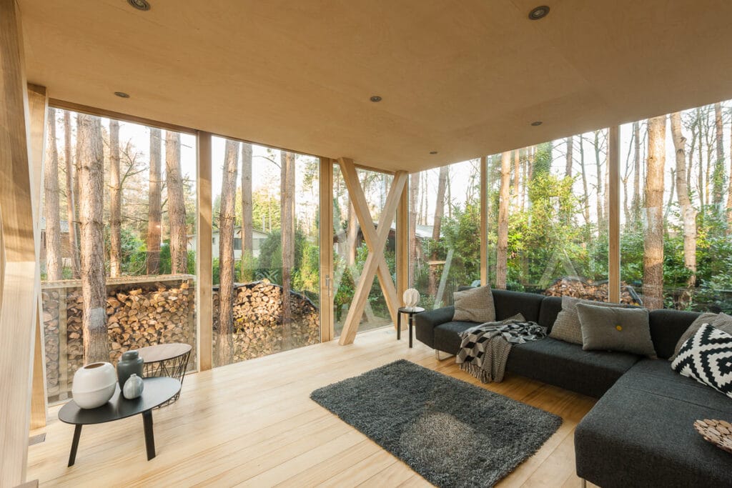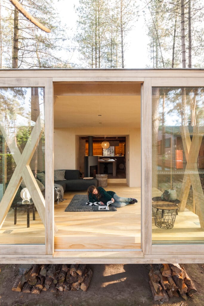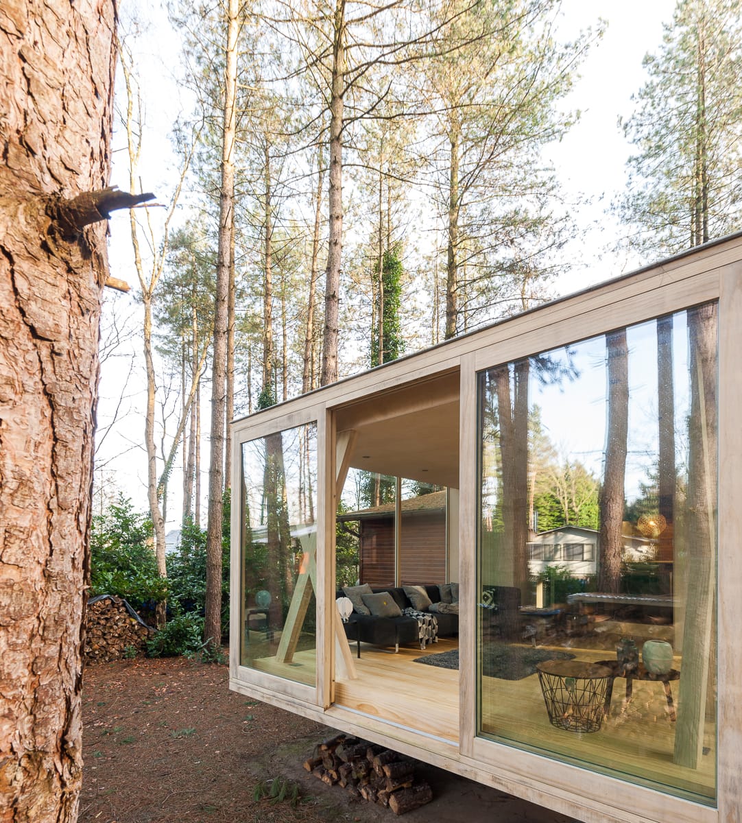 Waarom hout? Het antwoord laat zich raden: nature meets nature. Zowel voor het schrijnwerk als voor het parket werd accoya gebruikt, hightech hout waarvoor naaldhout uit duurzaam beheerde bossen bewerkt wordt tot een sterk en milieuvriendelijk product. De lichte kleur contrasteert met de donkere stammen buiten, maar dat is nu net het interessante van deze keuze. Er werd in eerste instantie gekozen voor een zwevend effect om gelijk te lopen met het vloerniveau van de chalet. Een mooie bijkomstigheid is dat het volume ook (letterlijk) ‘van de grond komt’ en zo minder ruimte ljikt in te nemen. Door het transparante karakter en de lichtheid van het houtskelet oogt het volume bovendien minder aanwezig en massief.
