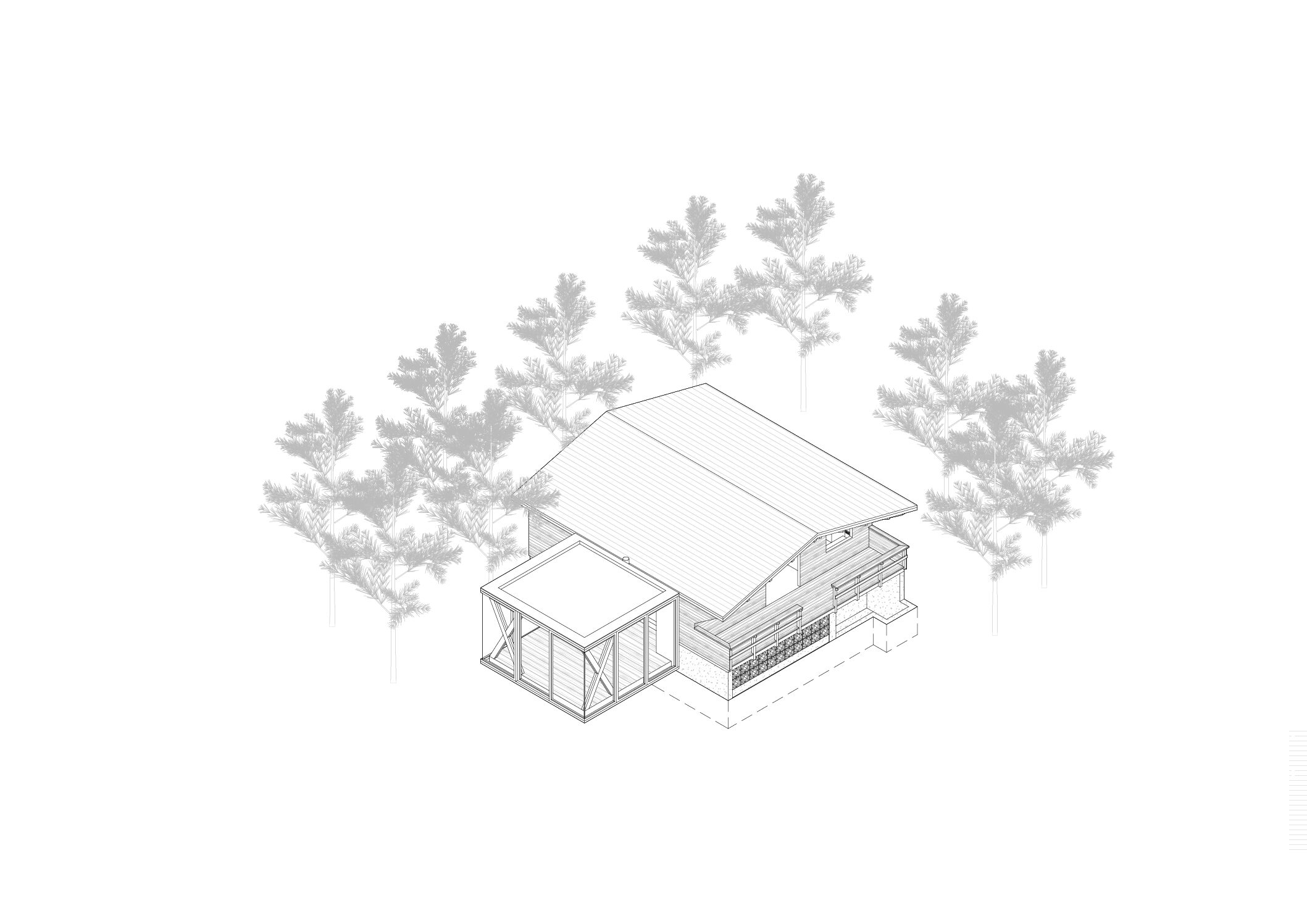 Waarom glas? Voor het licht en het uitzicht, dat lijkt evident, maar alleen door de bomen, die voor een natuurlijk gordijn van privacy zorgen, is deze aanpak in dit geval zinvol en haalbaar. Dat resulteerde in drie glazen wanden en één gesloten muur, aan de kant waar een corridor zich een weg baant naar het bestaande volume. De glaspartijen lopen verder door dan het plafond en raken de dakrand. Opnieuw zijn het de bomen die tot deze uitvoering uitnodigden: je blik wordt de hoogte ingetrokken richting hoge kruinen door schijnbaar niet-begrensde vensters. En wat meer is: door de reflectie in het glas lijken er dubbel zoveel bomen te staan als in werkelijkheid.