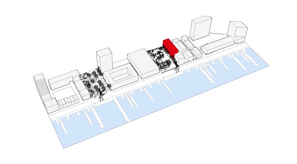 Voor het Kofschip is er gekozen om een eenduidig volume neer te zetten, waarbij de buitenschil als een doorlopende contour de randen van het volume afbakent. Het beschermde volume is iets compacter en zet zich op verschillende plaatsen terug ten opzichte van die bakstenen schil. De vrijgekomen ruimte wordt vervolgens de circulatie en het collectieve adres.