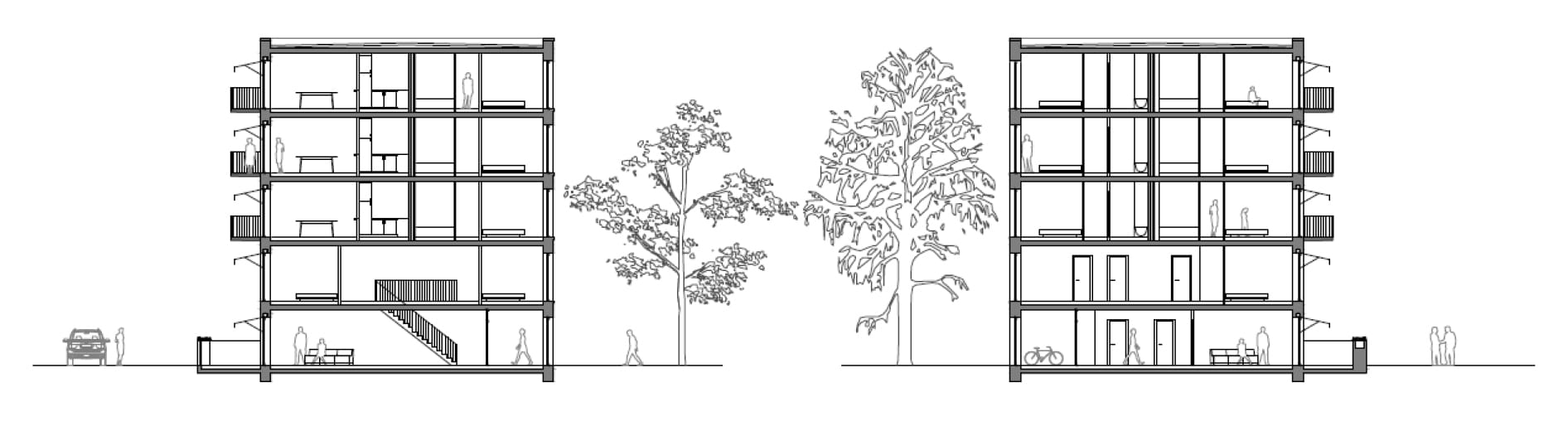 De appartementen op de gaanderij vinden het collectieve adres op de ‘kop’ van het gebouw, namelijk de afgeschuinde zijde op de kruising tussen de dwarsstraat en de krukas. Vervolgens leidt de buitentrap of de lift hen naar de tweede of derde verdieping. Op de gaanderijen vinden de bewoners dan hun voordeur die uitgeeft op de groene ruimte van de zuidelijke woongroenzone. Ook de appartementen zijn van het doorzonprincipe, maar hier zitten de leefruimtes naar het zuiden gericht (de dwarsstraat) en de slaapruimtes naar het noorden (de woongroenzone).