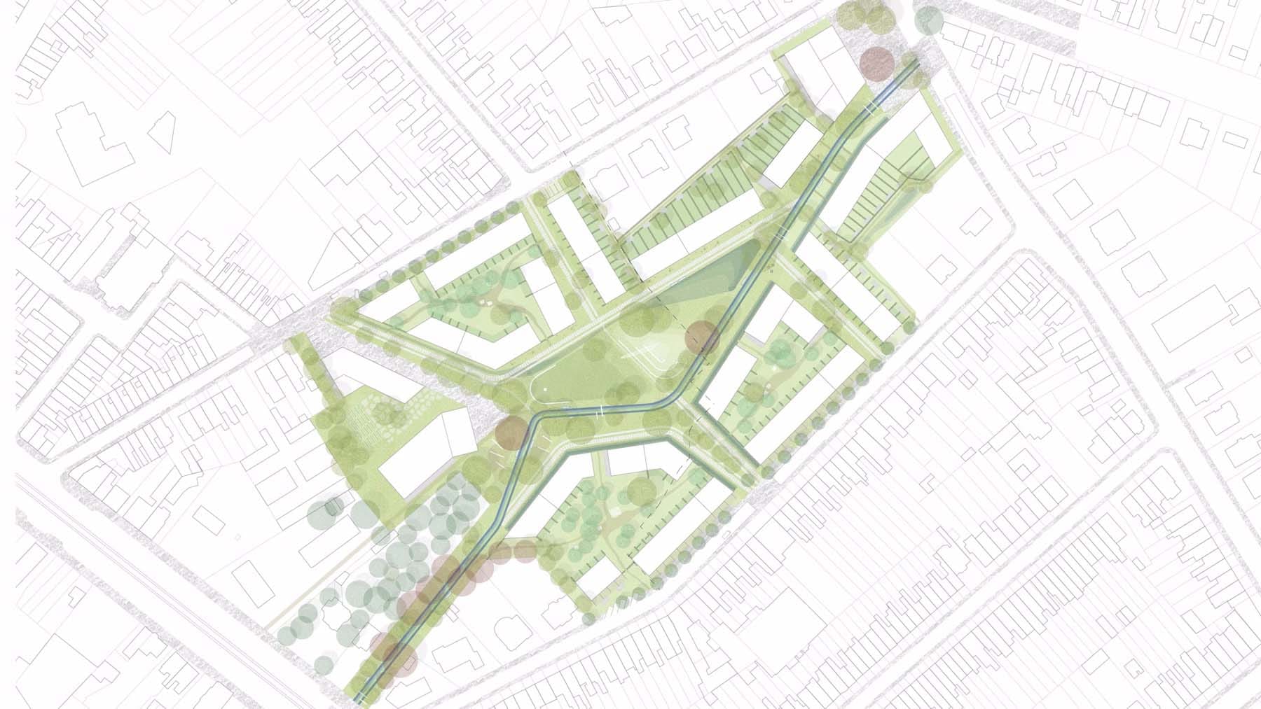 De wijk wordt gestructureerd rond een centraal wijkpark. In het parkontwerp worden referenties naar de sportgeschiedenis van de site opgenomen.