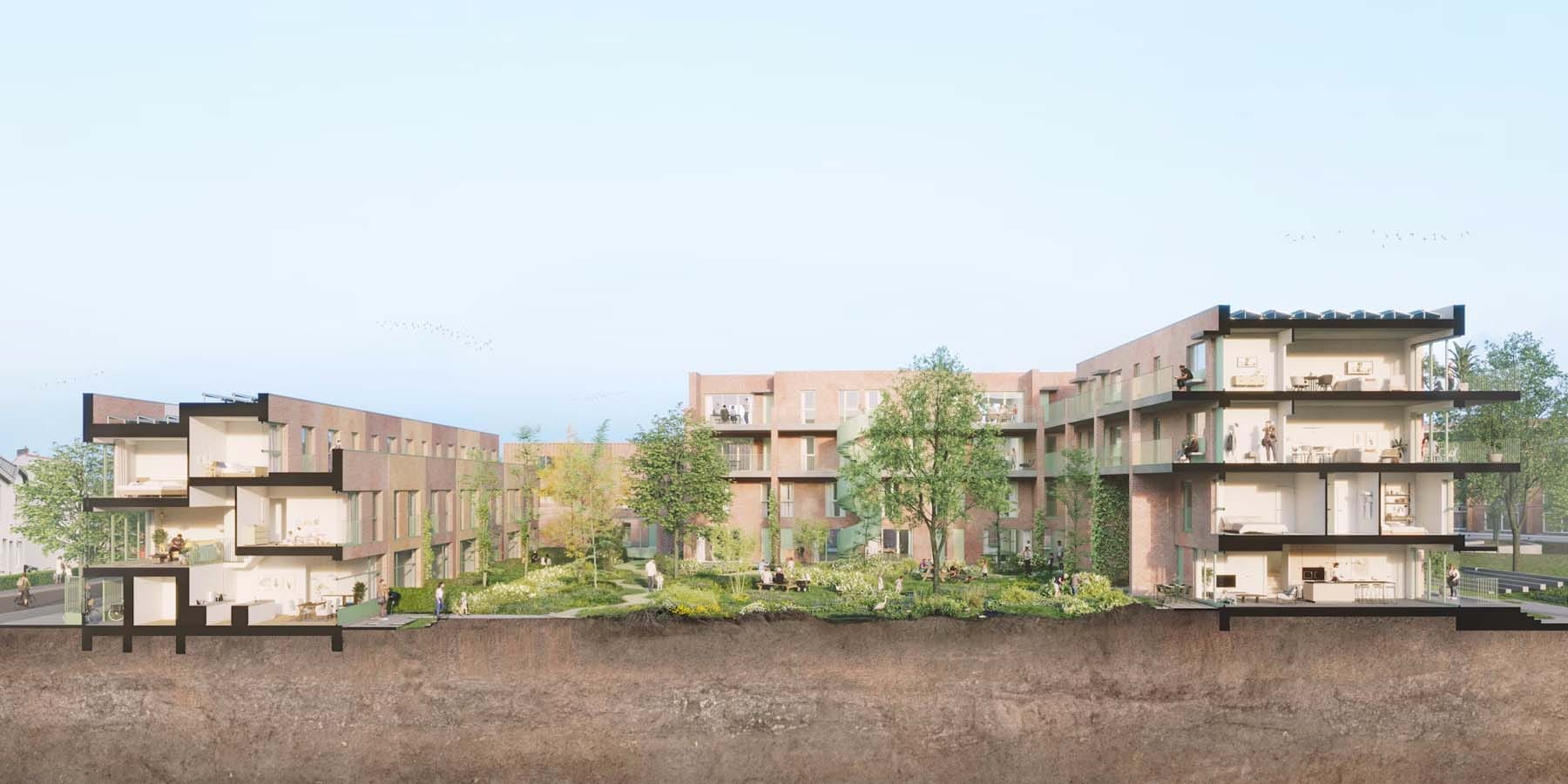 Er wordt gewoond en gewerkt rondom drie waterrobuuste binnenhoven die vormgegeven worden als intensieve aanvullingen op het buurtpark. Waar het buurtpark kan geassocieerd worden met trapvelden en weidse verpozingsplekken, met landschappelijke zitgelegenheden langs zonken in een glooiend geheel, worden de binnenhoven opgevat als intensief ingegroende gelaagde binnentuinen, waar de privatieve infiltratievoorzieningen een bepalende ontwerpfactor zijn gebleken.