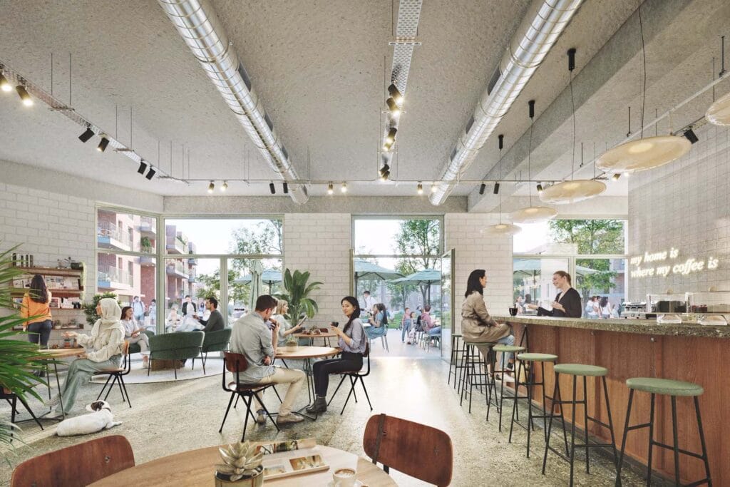 Het parkeren gebeurt integraal ondergronds; de lagere parkeerratio wordt gecompenseerd door deelauto’s, deelfietsen en andere faciliteiten.