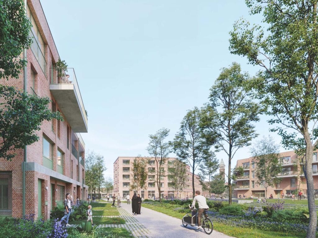 De wijk is integraal autovrij, waardoor het beeld van een klassieke straat plaatsmaakt voor kindvriendelijke groene ruimtes.