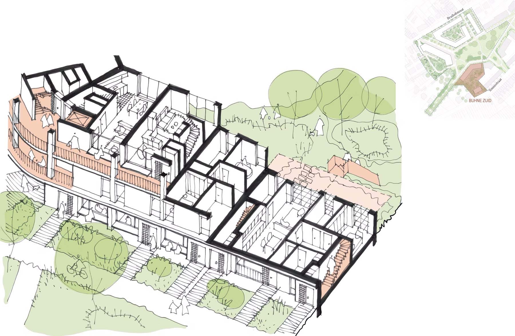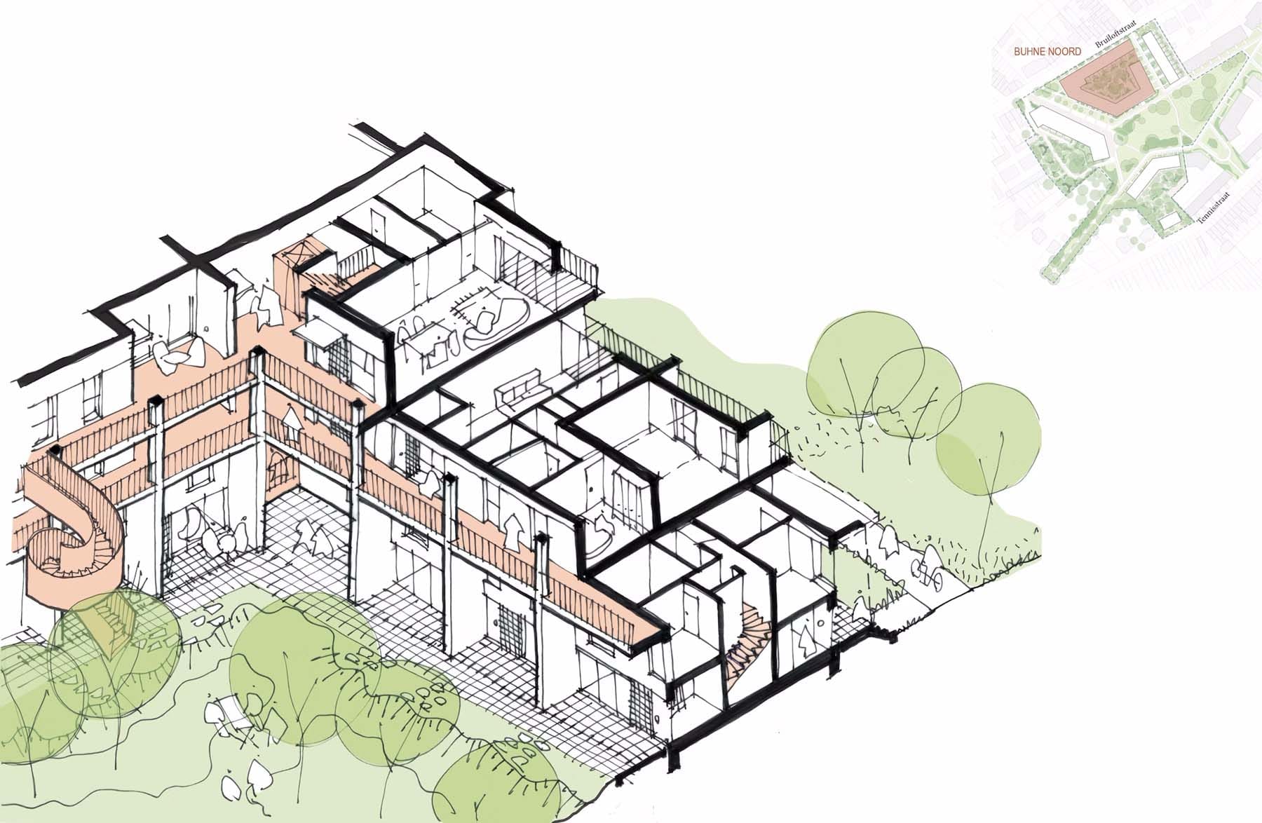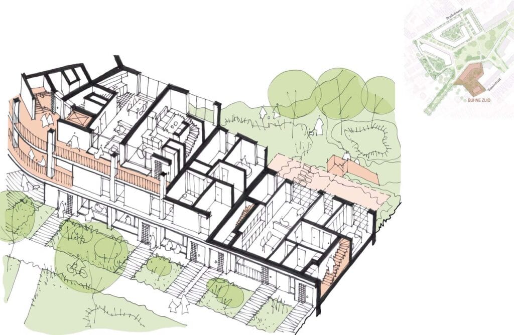 Buhne Zuid is een typologisch divers bouwblok, waarbij simplexen en duplexen zorgvuldig gestapeld en geschakeld worden.