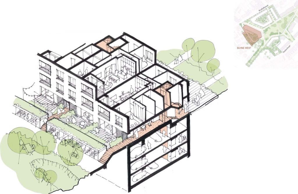 Buhne West presenteert zich als een stoer stadsgebouw, een cruciale schakel in het wijkdeel. Ondergronds krijgen het mobiliteitsvraagstuk en de gecentraliseerd technische ruimtes een plaats. De plint huisvest verschillende buurtondersteunende functies in relatie tot het voorliggende park.