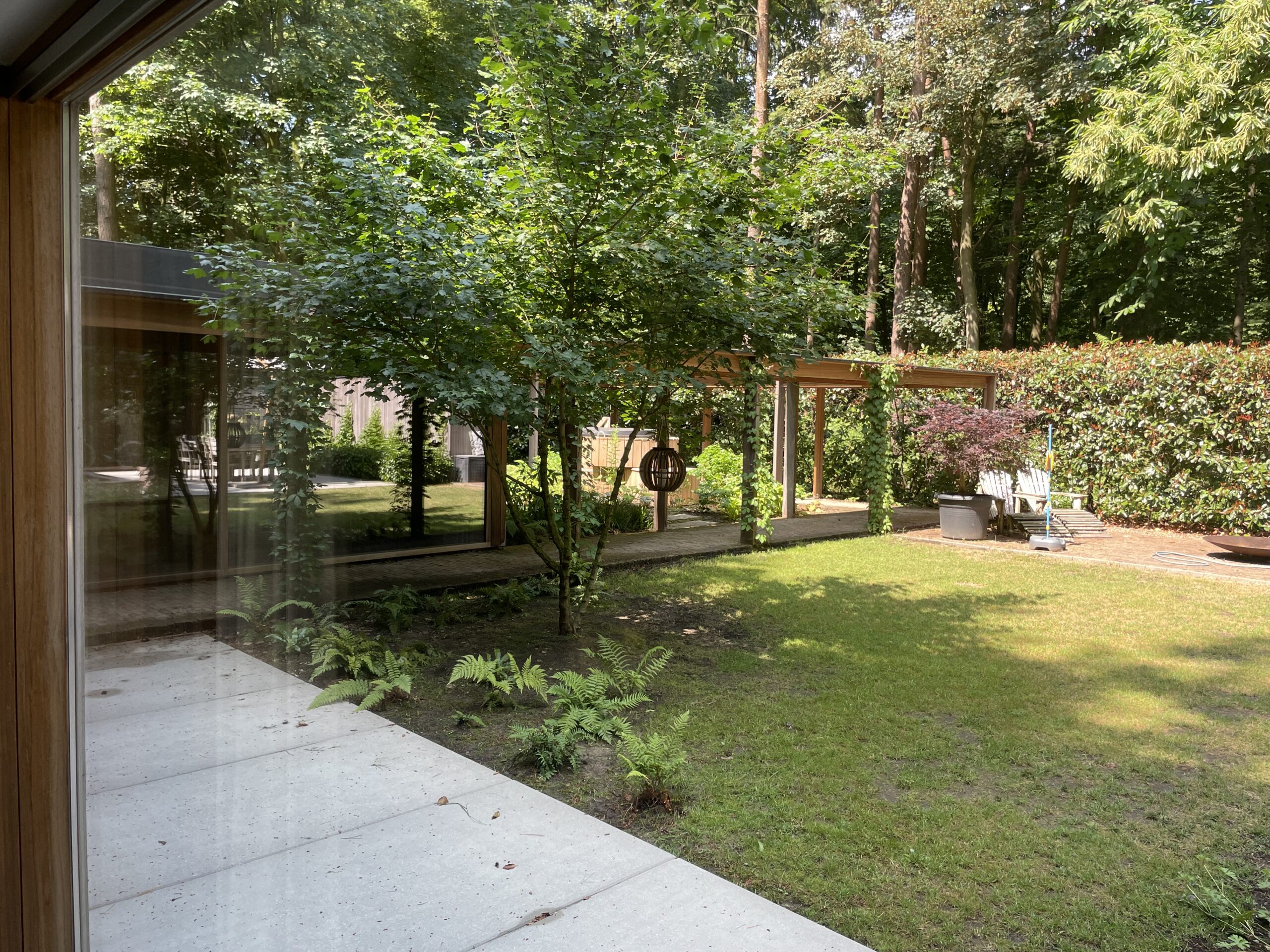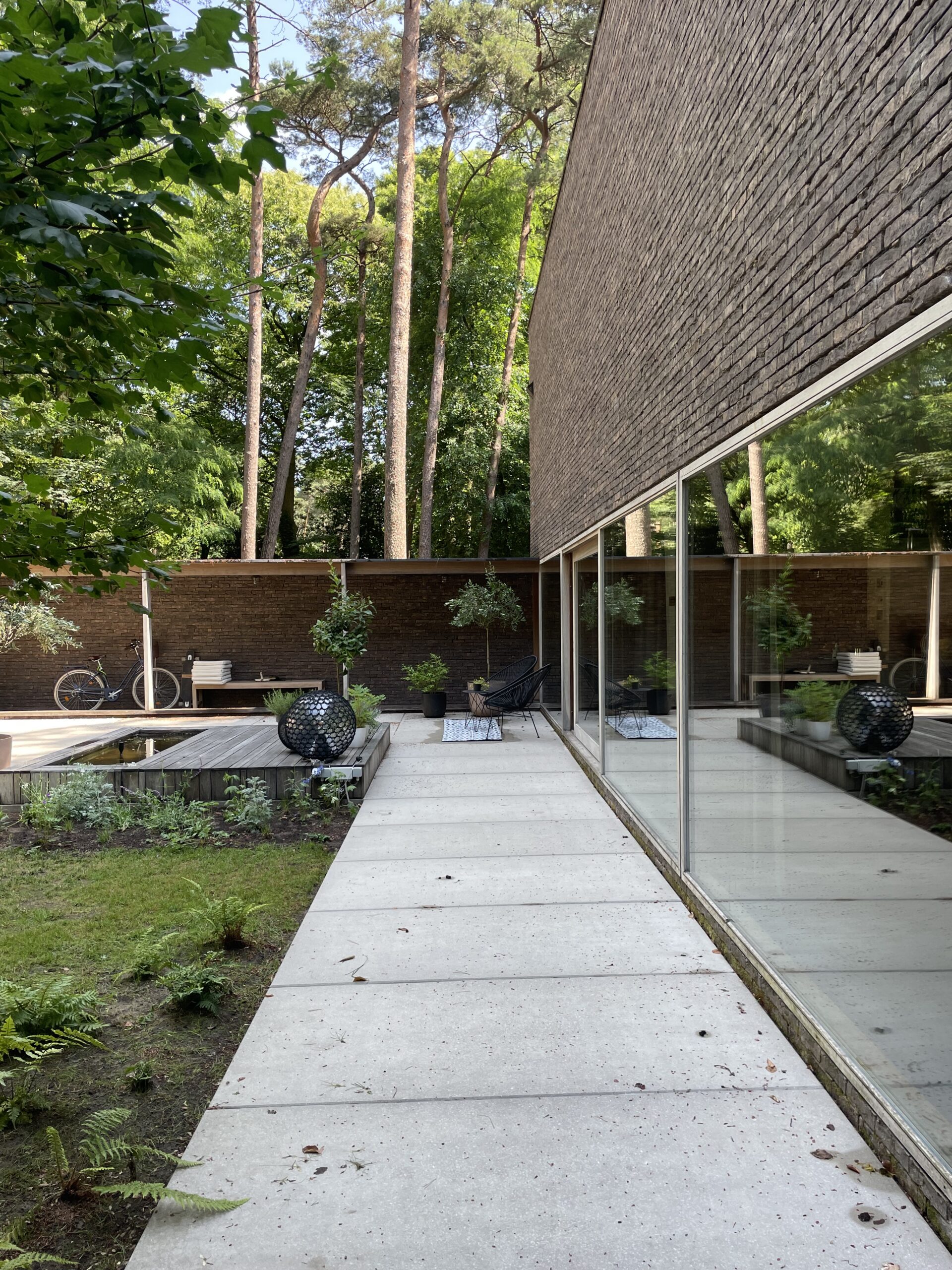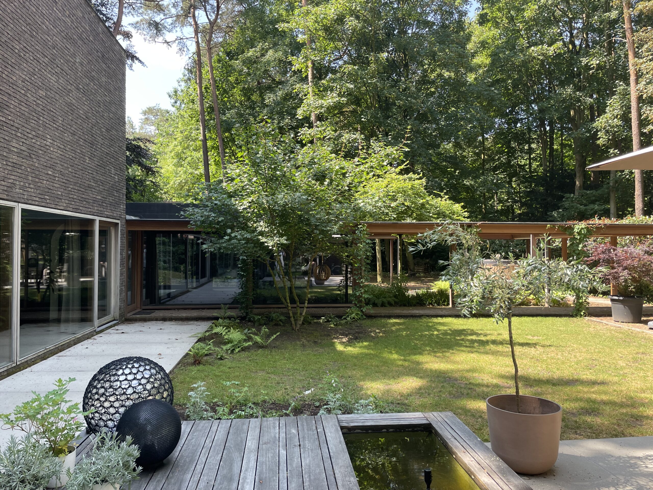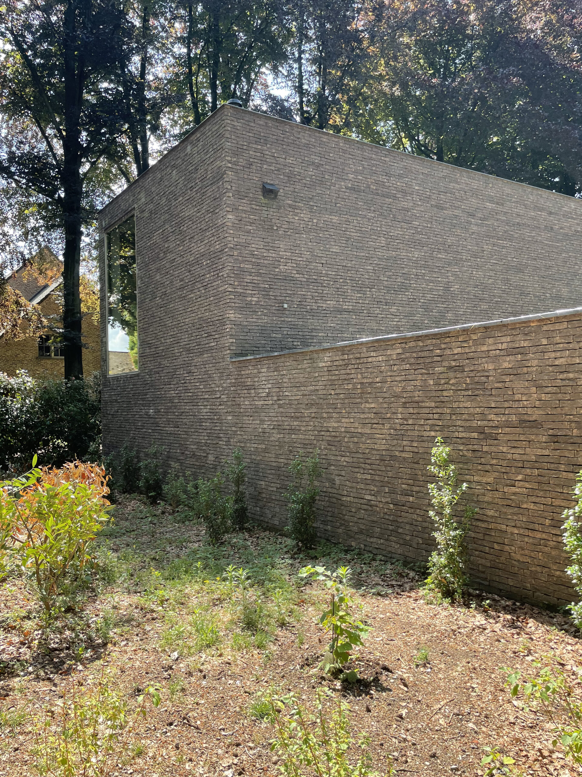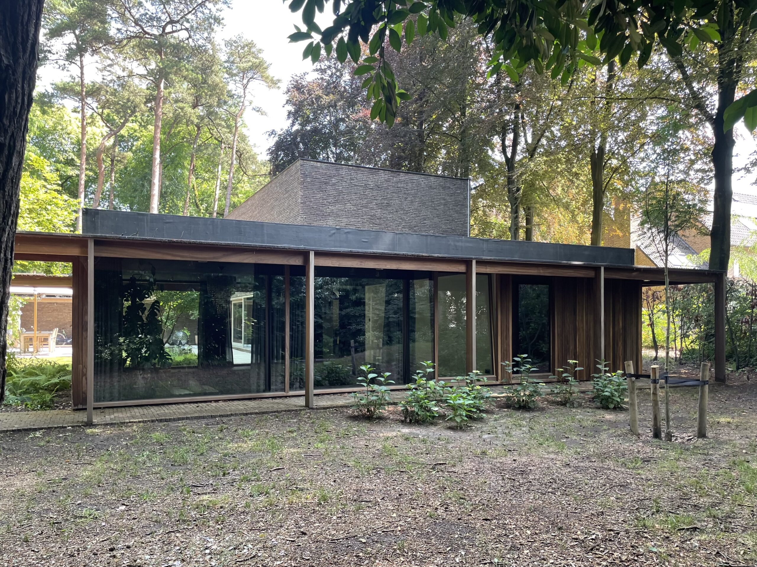 Dit uitgangspunt beschreven in de nota van de bouwaanvraag in 20/11/2008 van de huidige woning legt de toon voor de aanvraag van de uitbreiding op de dag van vandaag. De uitbreiding met dieper gelegen zithoek en gastenkamer is een antwoord op de vraag voor meer intimiteit en afzondering binnen een gezin met twee opgroeiende kinderen. Een volume uit één bouwlaag met dieper gelegen zithoek en slaapkamer met wasruimte wordt achteraan de woning toegevoegd en wordt gematerialiseerd in hout en glas. De kroonlijsthoogte van dit volume stemt overeen met de kroonlijst van de huidige zuilengang en garage. Een open houten kolommen-structuur werkt de figuur van de gecultiveerde binnentuin -lees : de open plek in het bos- verder af. Door de afwezigheid van een omheining of haag rondom het perceel biedt de extra uitbreiding meer privacy tegenover de achterliggende buren en naastliggende oprijlaan waardoor het bosrijke karakter vanaf de openbare weg bewaard blijft. De bomen die moeten wijken voor de uitbreiding worden gecompenseerd op andere plaatsen op het terrein.