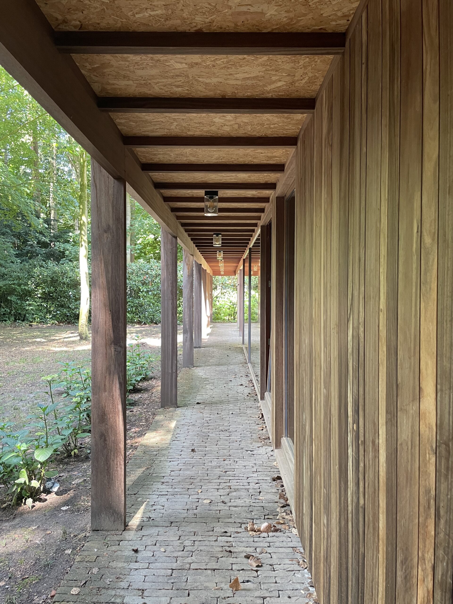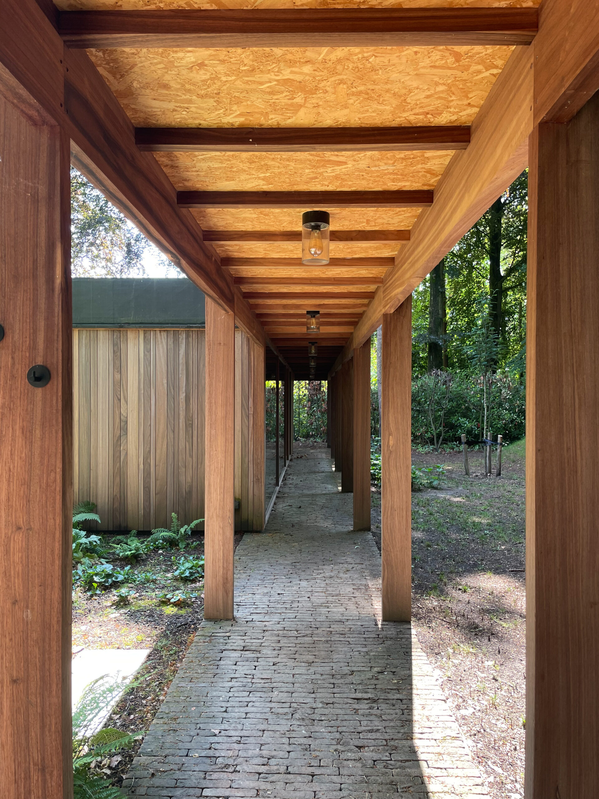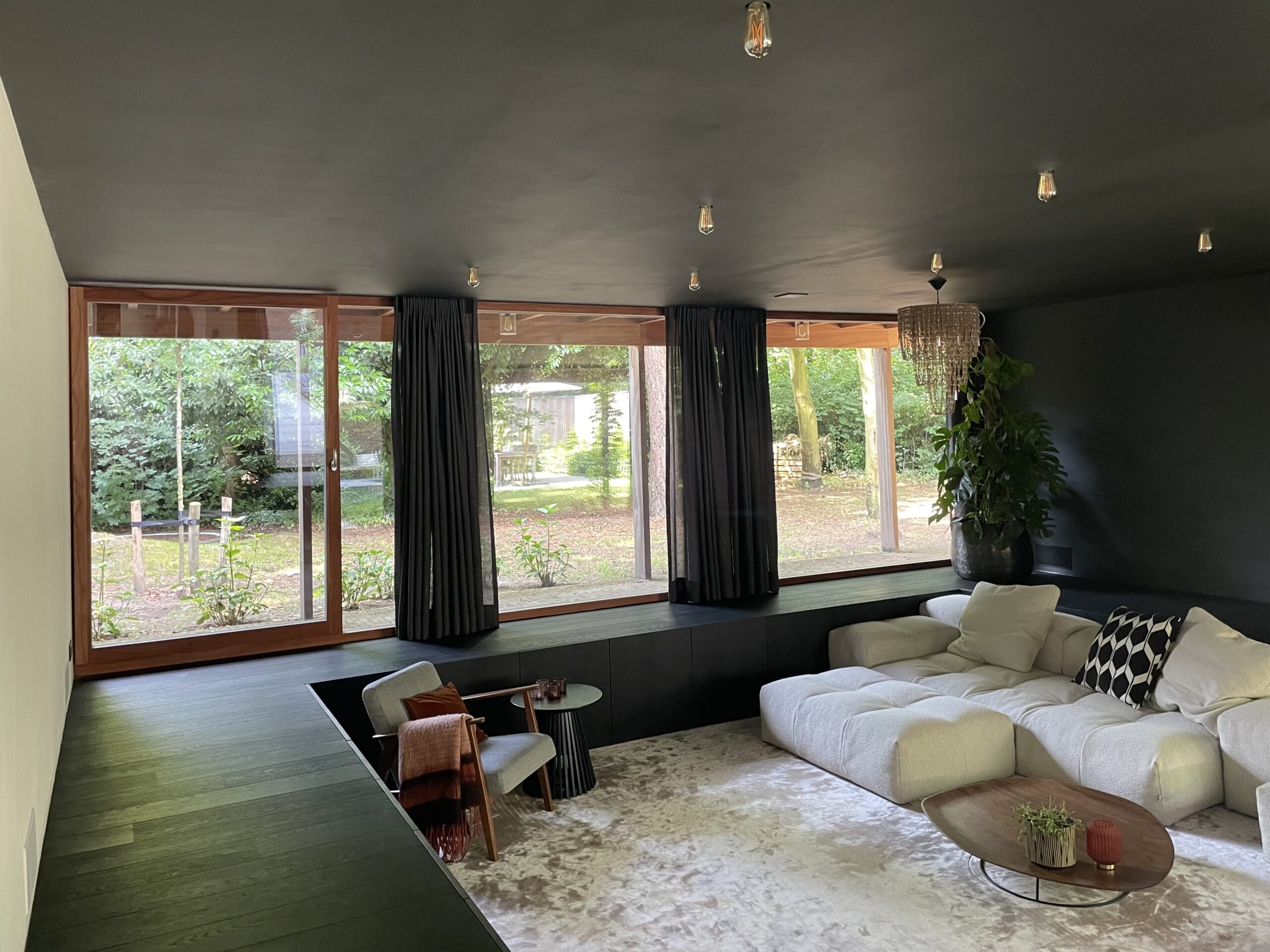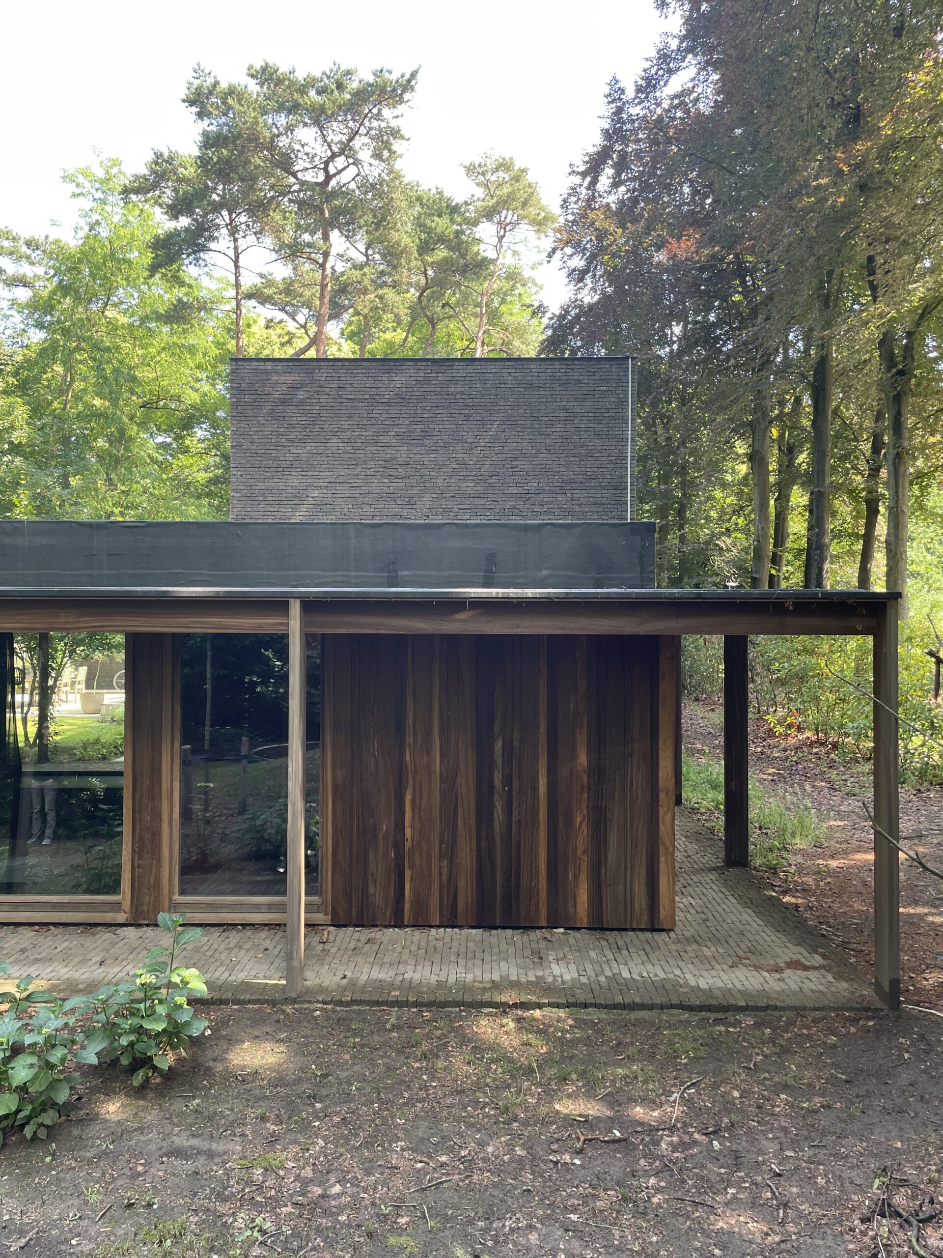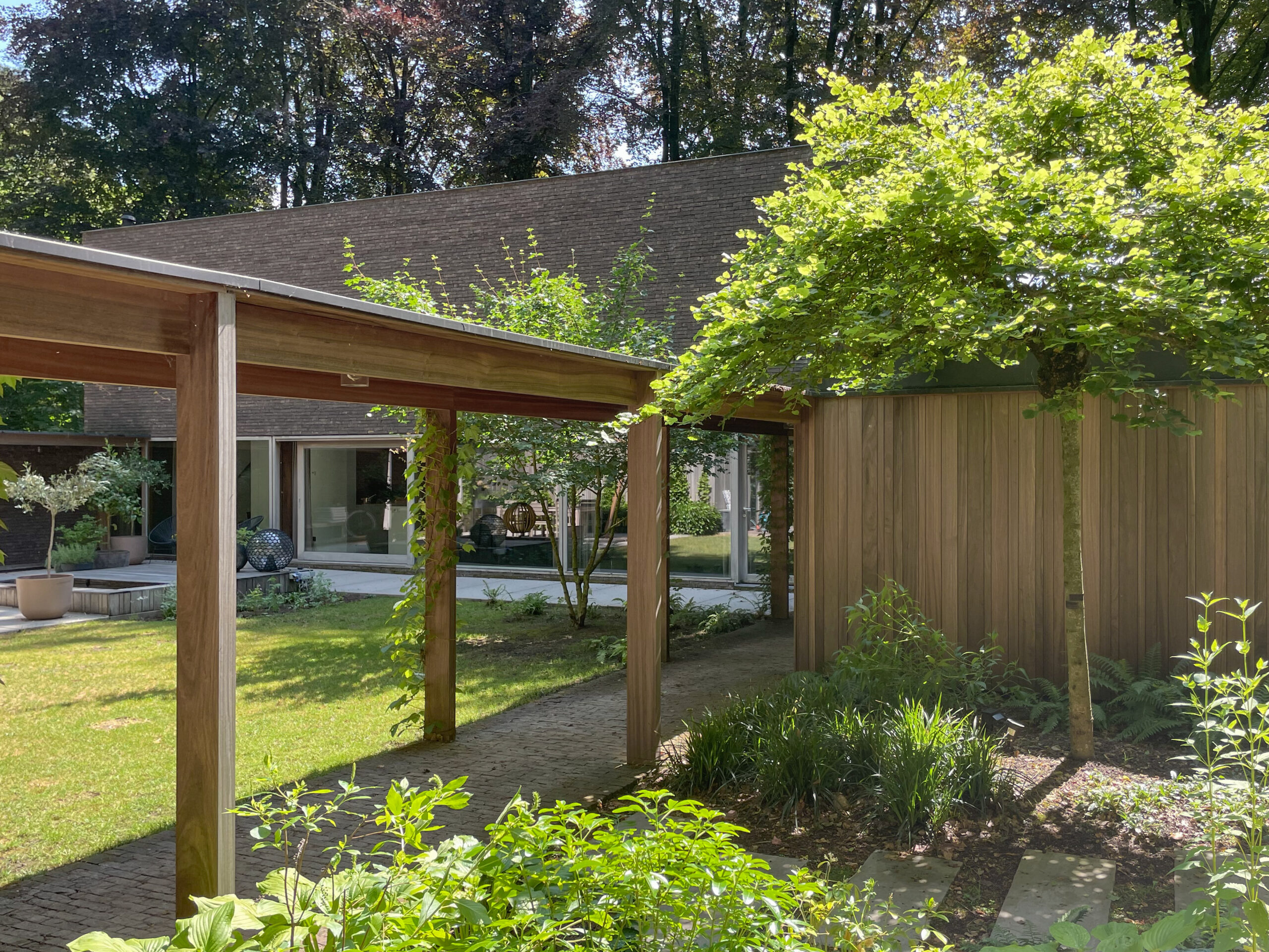Dit uitgangspunt beschreven in de nota van de bouwaanvraag in 20/11/2008 van de huidige woning legt de toon voor de aanvraag van de uitbreiding op de dag van vandaag. De uitbreiding met dieper gelegen zithoek en gastenkamer is een antwoord op de vraag voor meer intimiteit en afzondering binnen een gezin met twee opgroeiende kinderen. Een volume uit één bouwlaag met dieper gelegen zithoek en slaapkamer met wasruimte wordt achteraan de woning toegevoegd en wordt gematerialiseerd in hout en glas. De kroonlijsthoogte van dit volume stemt overeen met de kroonlijst van de huidige zuilengang en garage. Een open houten kolommen-structuur werkt de figuur van de gecultiveerde binnentuin -lees : de open plek in het bos- verder af. Door de afwezigheid van een omheining of haag rondom het perceel biedt de extra uitbreiding meer privacy tegenover de achterliggende buren en naastliggende oprijlaan waardoor het bosrijke karakter vanaf de openbare weg bewaard blijft. De bomen die moeten wijken voor de uitbreiding worden gecompenseerd op andere plaatsen op het terrein.