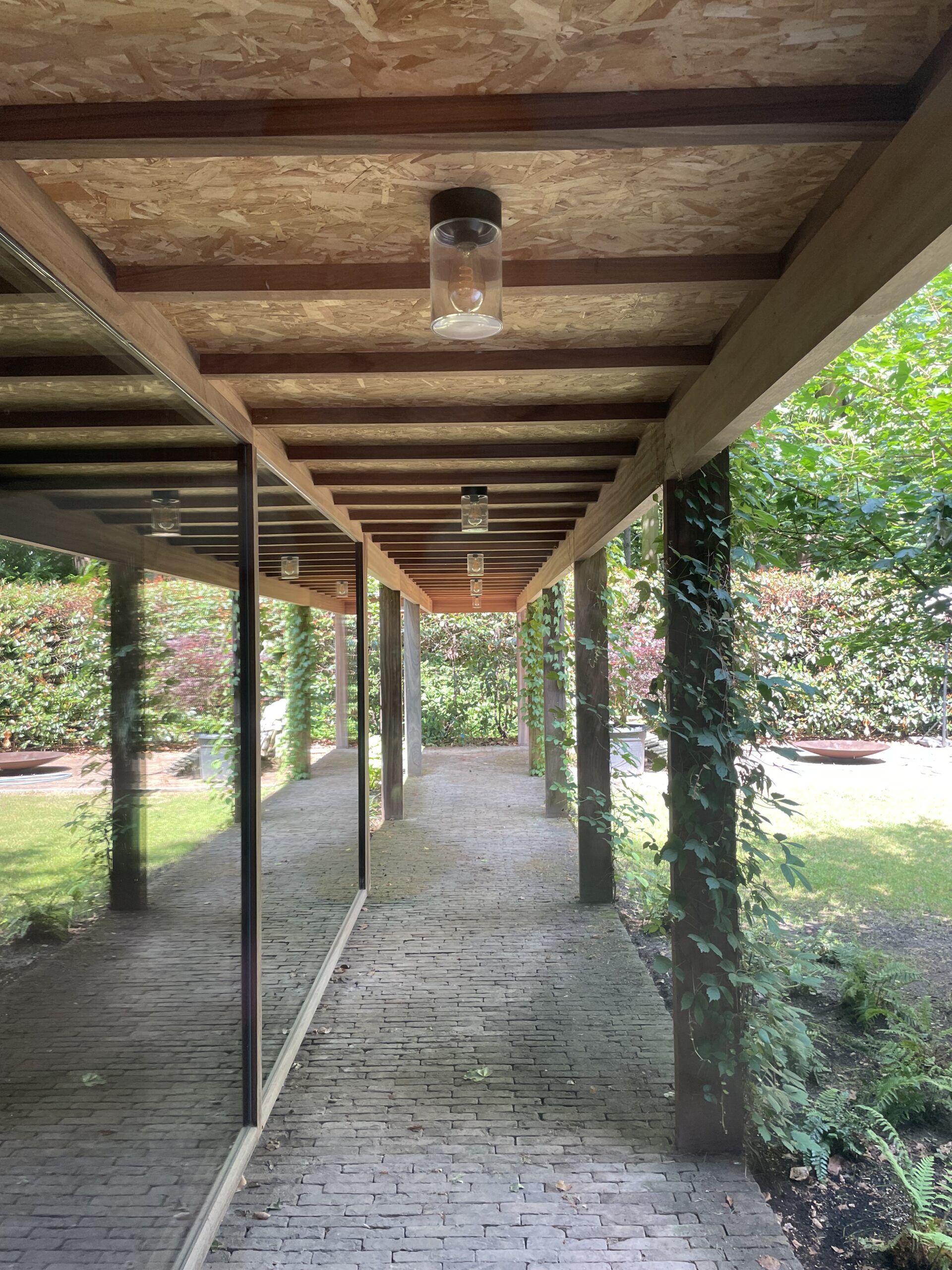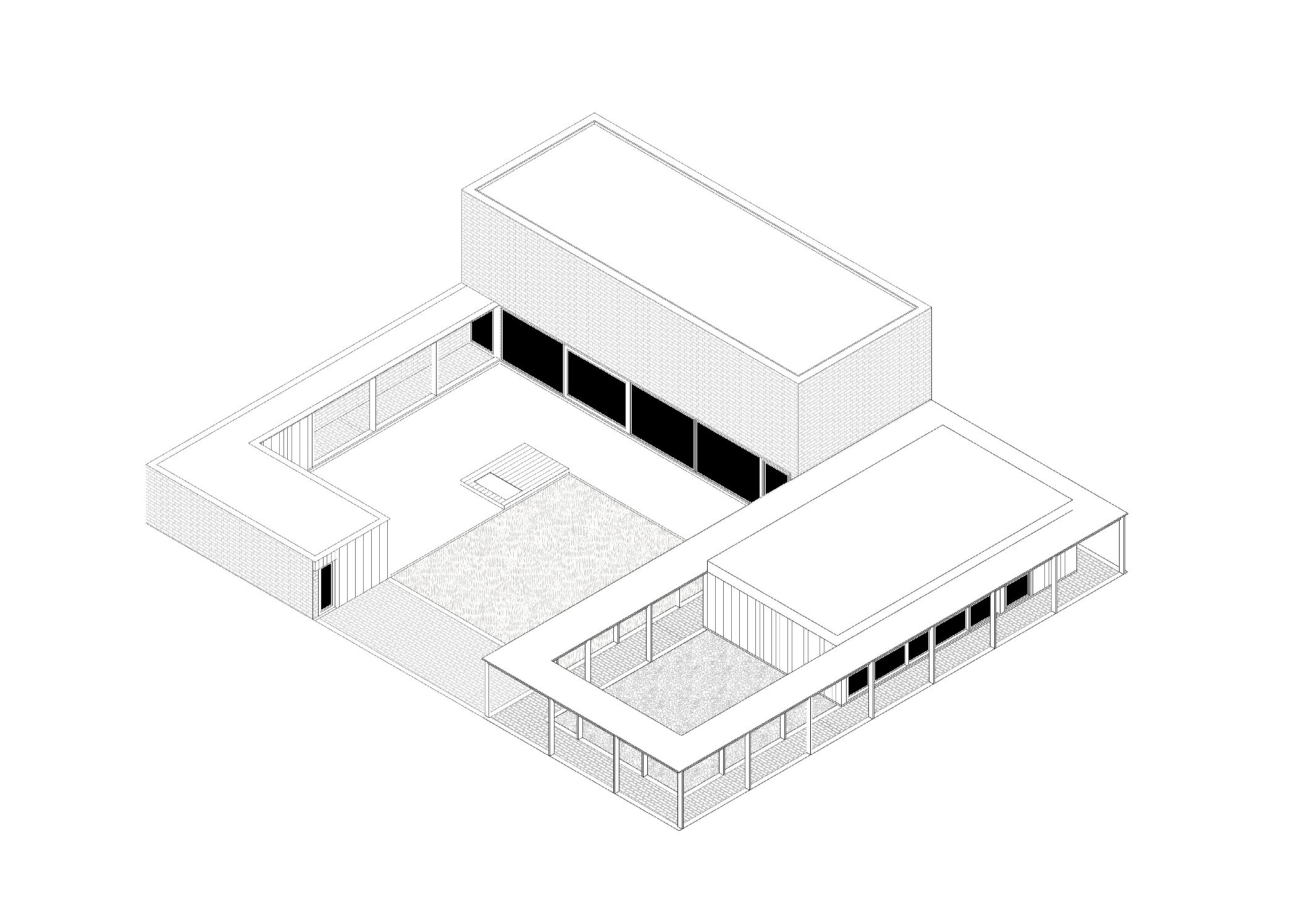 Het oorspronkelijke project bestond uit twee volumes (huis en garage) verbonden door een looppad. Toen ons werd gevraagd om een uitbreiding te realiseren, besloten we om dit deel te laten uitmaken van deze “route door het bos” door middel van een eigentijdse vertaling van een peristilium. Zo ontstaat er een volume binnen deze route, stil en in harmonie met de omgeving en natuur, waarbij verschillende soorten groene ruimtes binnen hetzelfde huis worden afgebakend. Dit zorgt voor privacy op een attente manier en genereert verschillende perspectieven op het omliggende bos.