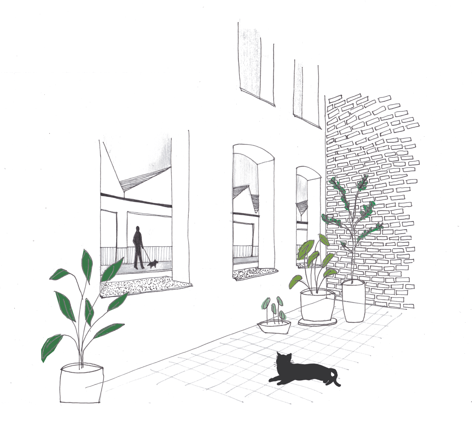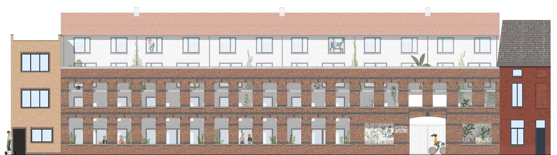 We passen de straatgevel zo weinig mogelijk aan. De raam-nissen worden opengemaakt maar hun afmetingen blijven behouden. Er worden géén extra deuropeningen of adressen gemaakt. De poort met het naambord van “Fonderie Cupro” blijft herkenbaar als het enige, collectieve adres voor alle woningen.