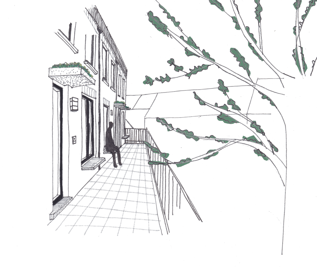 Slaapkamers grenzen nooit rechtstreeks aan de collectieve binnentuin of de galerij, en worden daardoor gevrijwaard van privacy-conflicten.