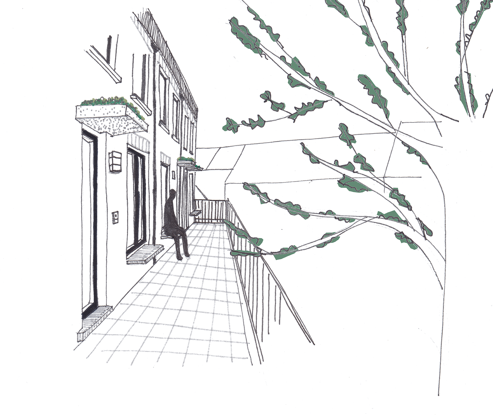 We plaatsen over de volledige straatlengte van het perceel een compact nieuwbouwvolume op 2,10 m achter de bestaande straatgevel. De afstand tussen de bestaande straatgevel en het nieuwe bouwvolume zetten we in als een zone voor private terrassen. Deze terrassen zijn zuidelijk gericht, en dankzij de bestaande straatgevel op een kwalitatieve manier afgeschermd van de straat. De terrassen bevinden zich op deze manier ook consequent buiten het beschermd woonvolume en kunnen worden opgevat als een “koude structuur”, wat resulteert in een goede bouwknopen- en koudebrugbeheersing.