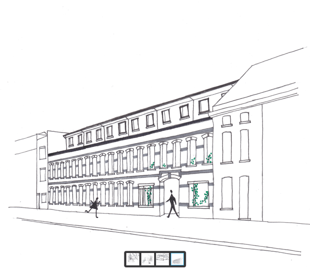 De straatgevel ademt de geschiedenis van de plek en de wijk, en verankert het project in de stedenbouwkundige context op een vanzelfsprekende wijze door zijn materialisatie, detaillering en geleding. Een nieuwbouwgevel kan dit niet beter. We behouden daarom de straatgevel. De straatgevel heeft een geleding die goed inzetbaar is voor het woonprogramma. We zetten de straatgevel daarom in als maatgevend element voor het ontwerp, en streven zo naar een synergie tussen oud en nieuw. De breedtes van de nieuwe woningen worden afgestemd op de traveemaat van de bestaande gevel.