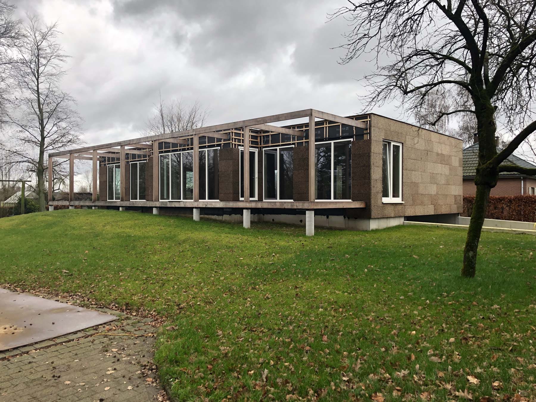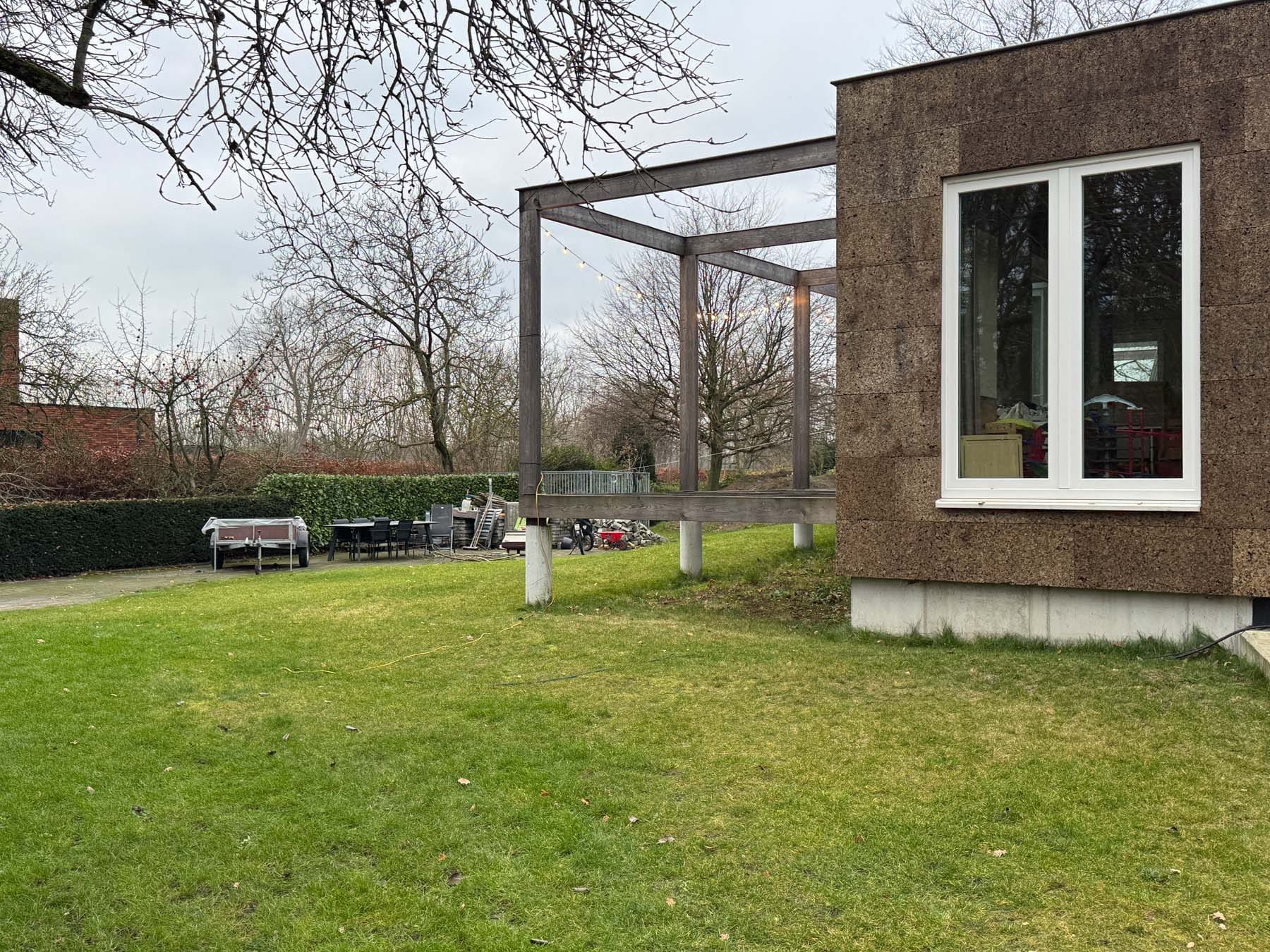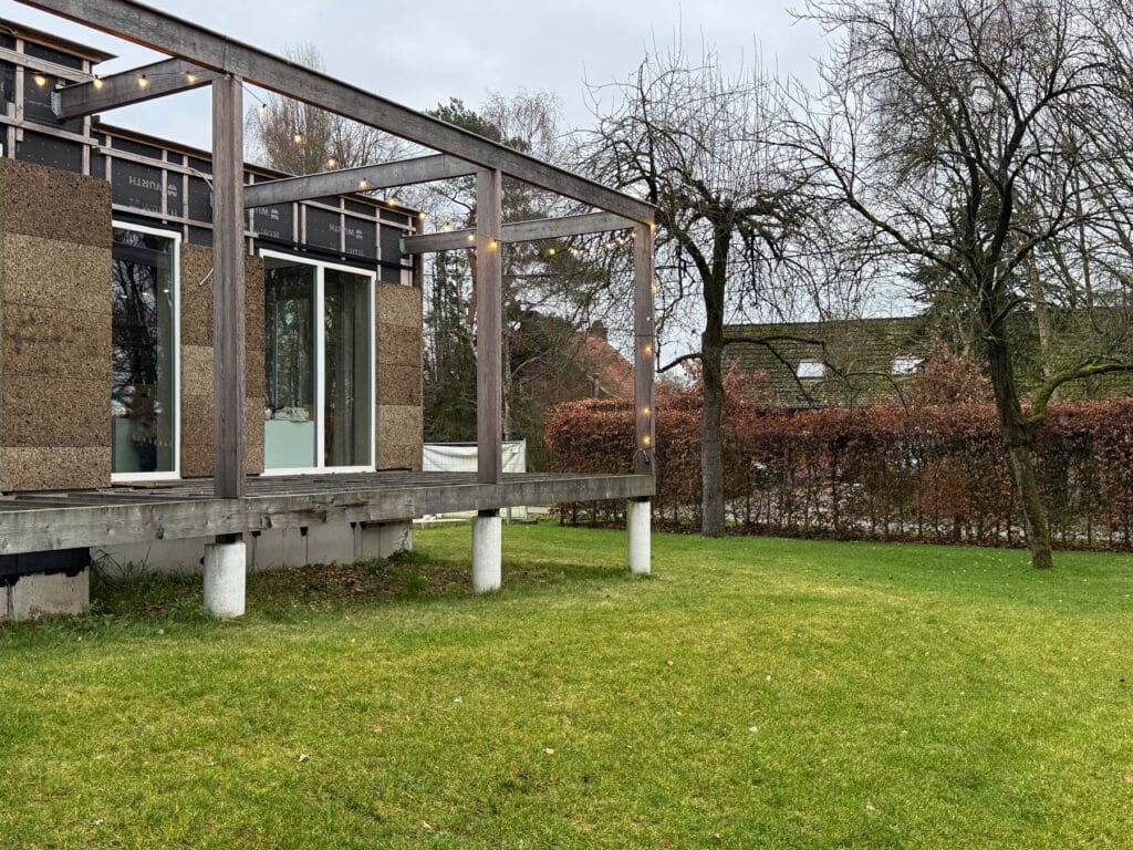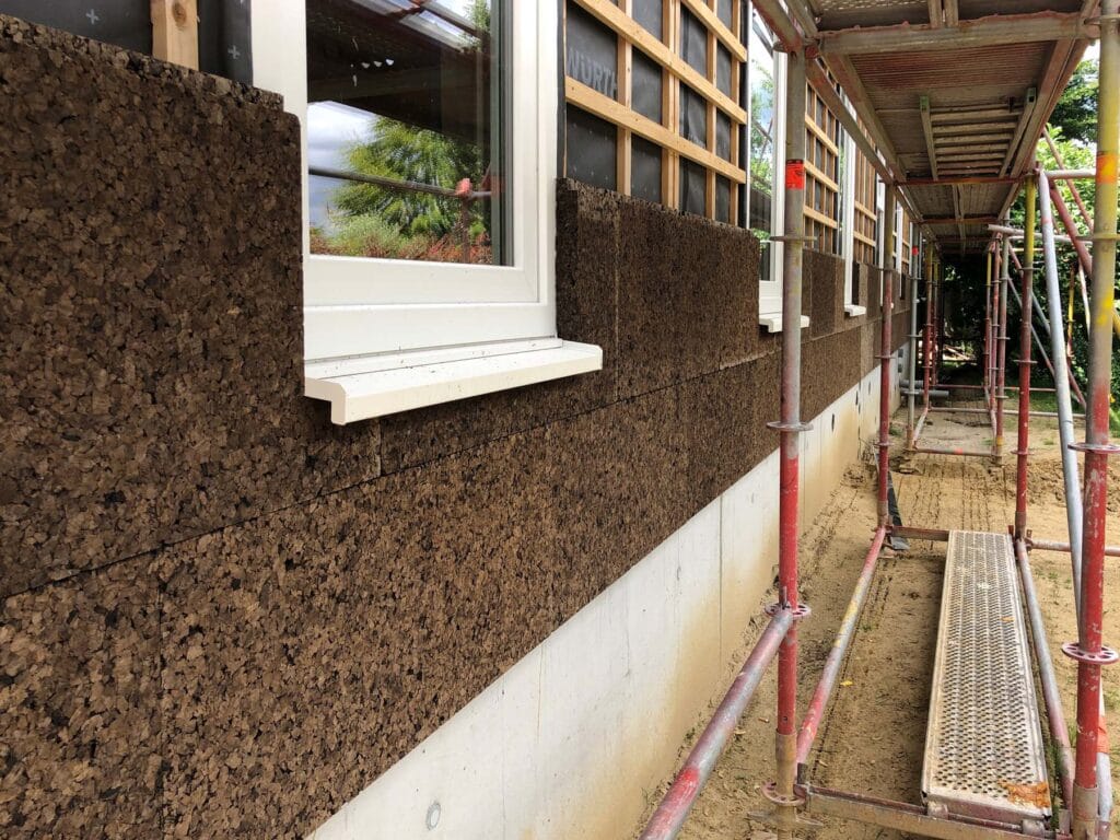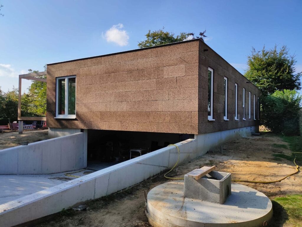 De woning is opgebouwd in prefab houtskelet, afgewerkt met een gevelbekleding in kurk – een natuurlijk, ademend en isolerend materiaal dat zich zacht in de groene omgeving voegt.