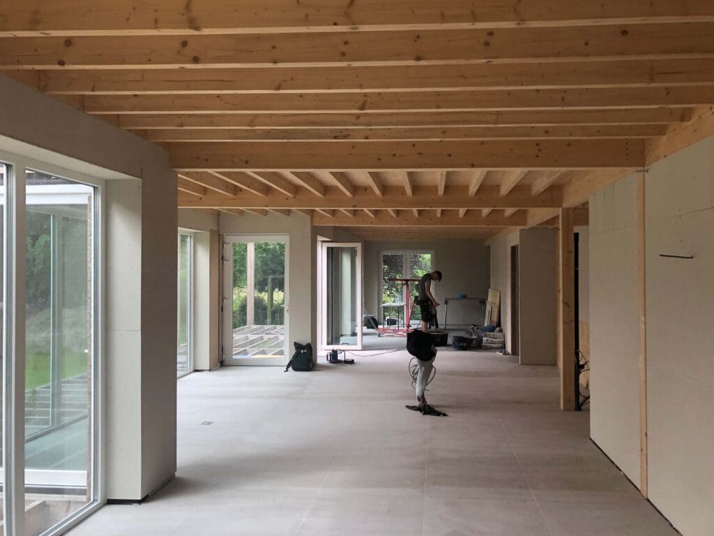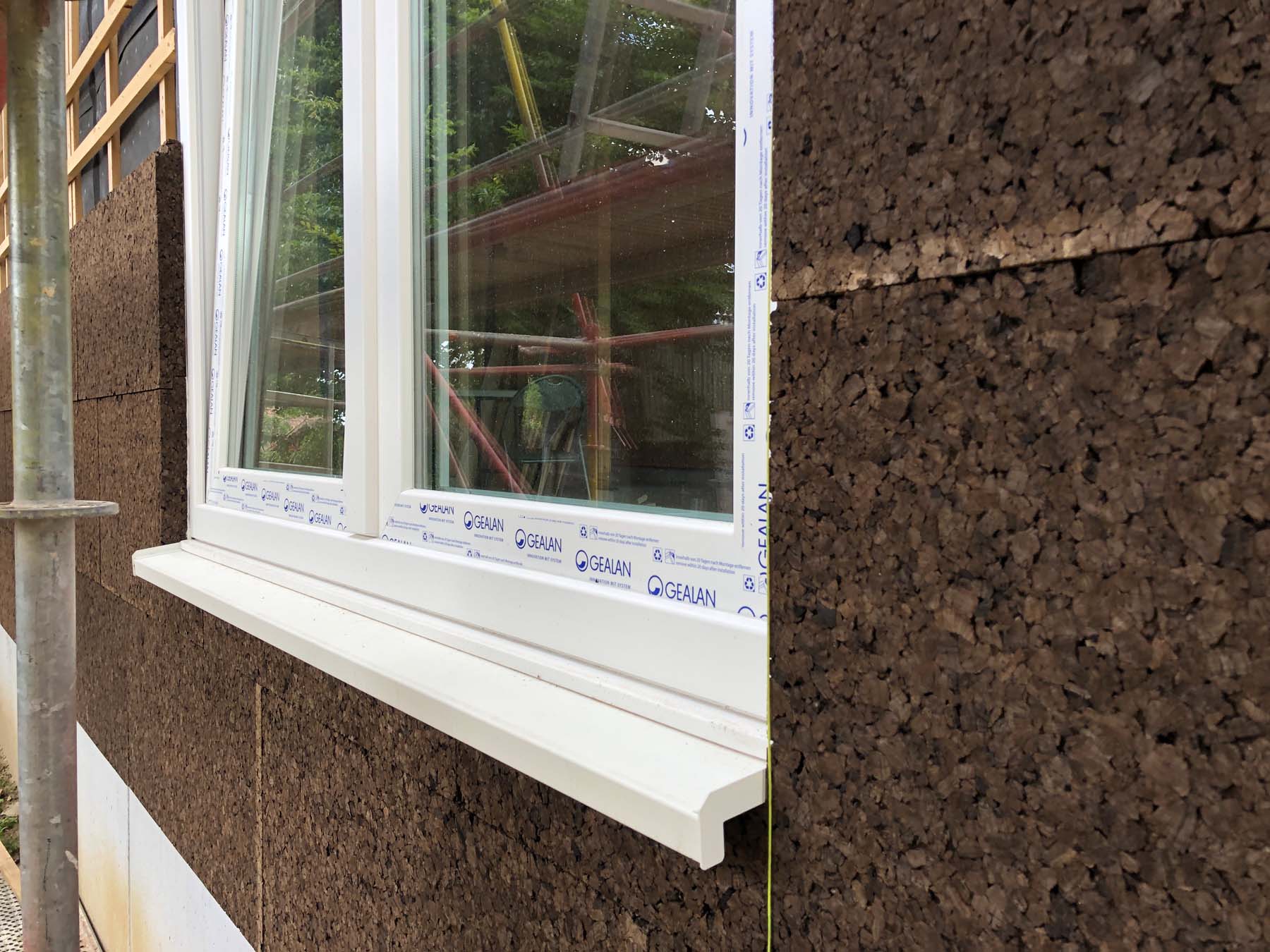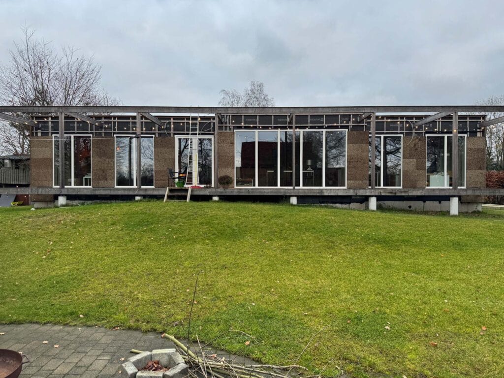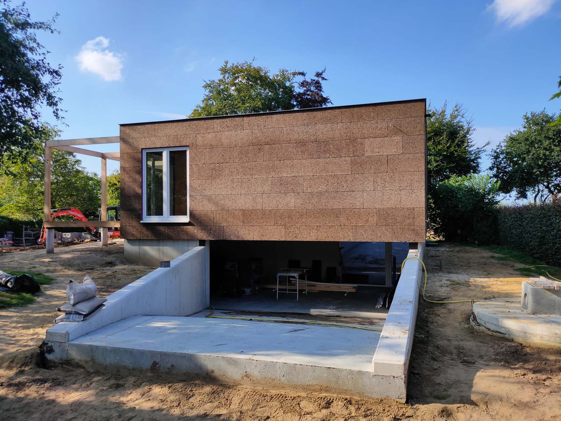 De woning is opgebouwd in prefab houtskelet, afgewerkt met een gevelbekleding in kurk – een natuurlijk, ademend en isolerend materiaal dat zich zacht in de groene omgeving voegt.