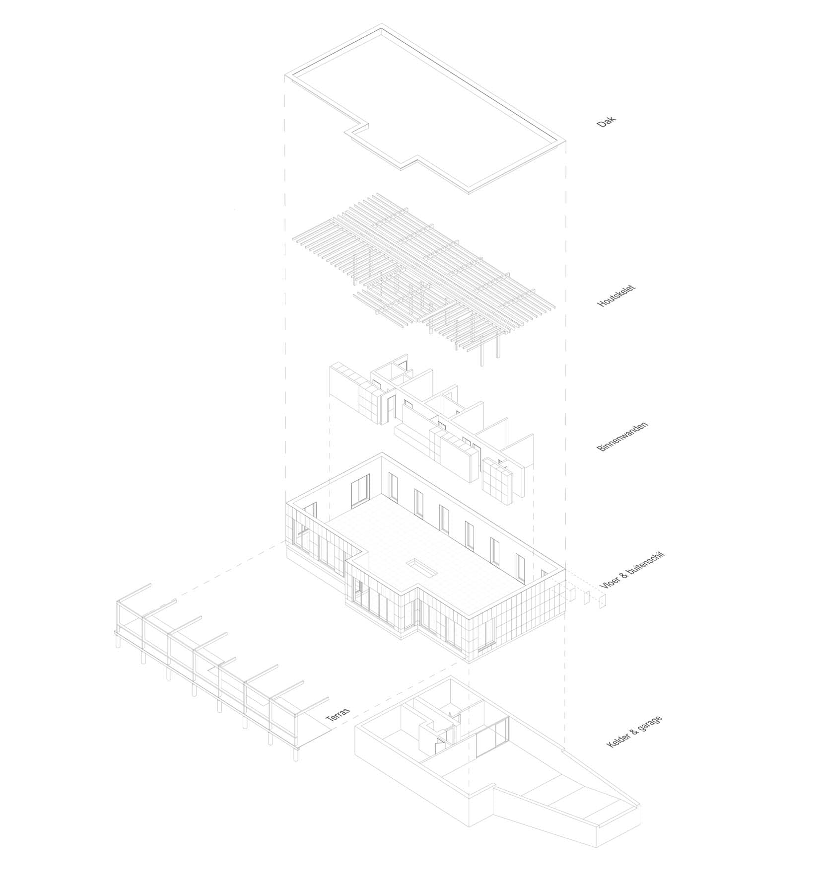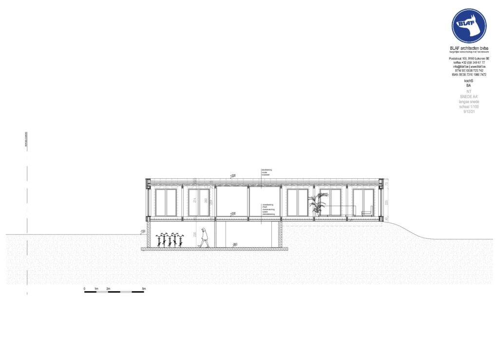 De nieuwe woning bestaat uit één opgetilde bouwlaag met alle woonfuncties op gelijk niveau, rustend op een half-verzonken kelderverdieping die fungeert als technische en toegangszone. De (rolstoel)toegankelijkheid staat centraal: beide niveaus zijn verbonden via een zachte helling en een centrale trap, met toekomstgerichte voorzieningen voor verdere aanpassing.