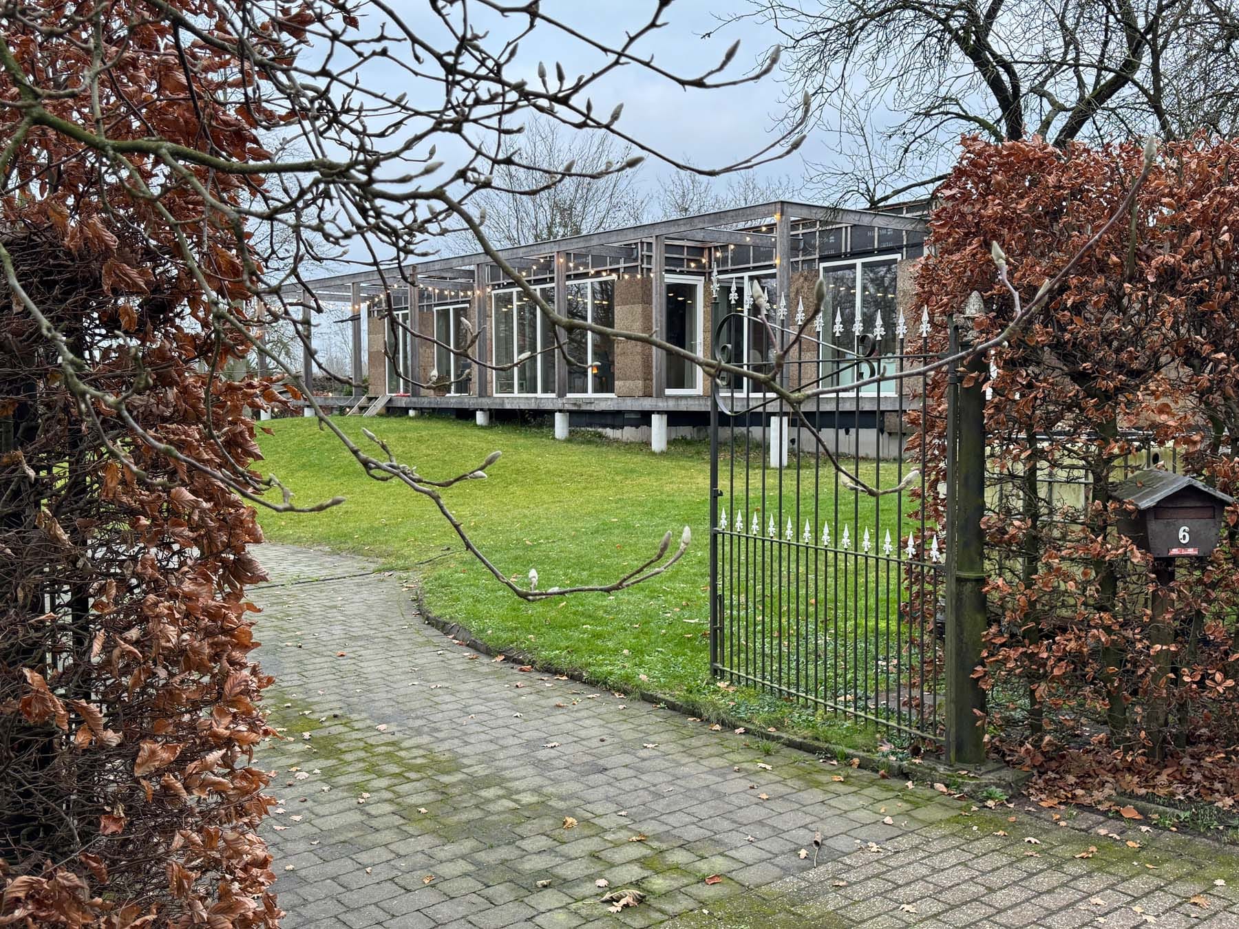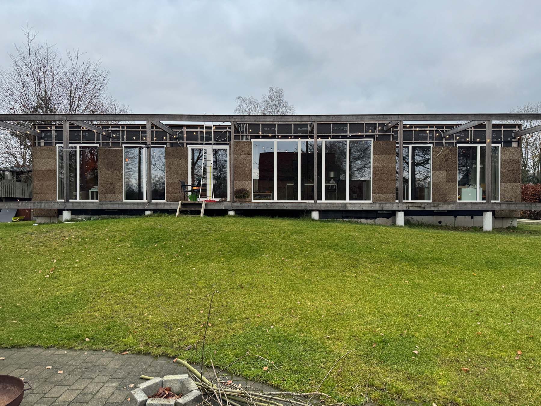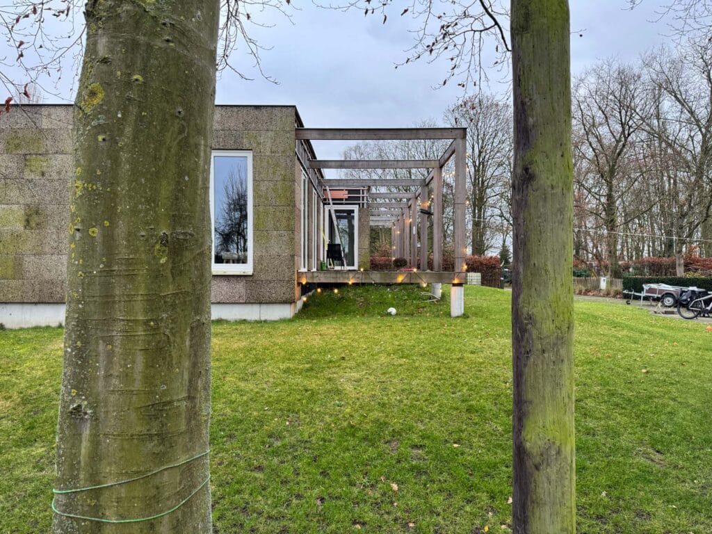 In een landelijke context werd een bestaande woning zorgvuldig gesloopt en deels hergebruikt om plaats te maken voor een nieuwe, toegankelijke en duurzame woning. De bouwheer – eigenaar van twee kavels – kiest bewust voor een compacte invulling van slechts één perceel, wat een genereuze tuinzone mogelijk maakt.