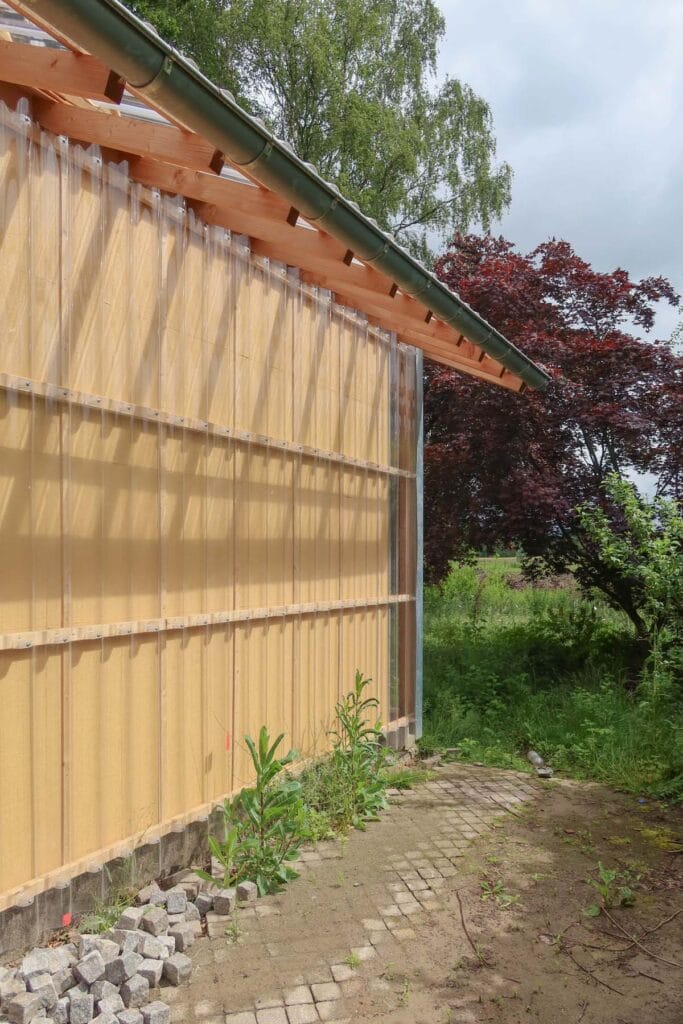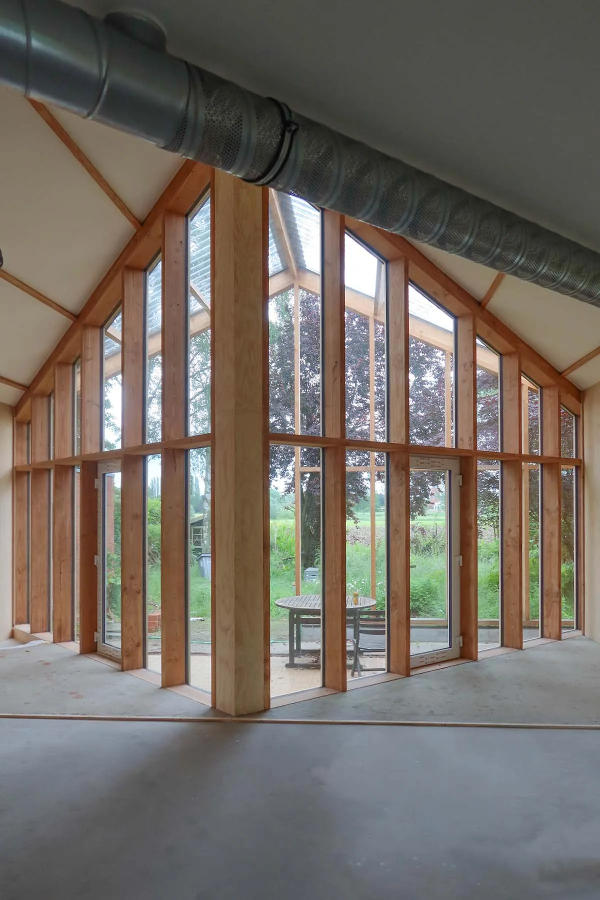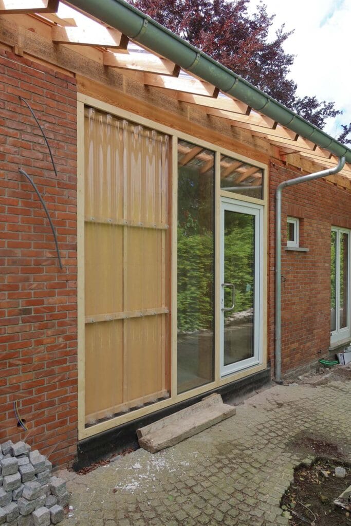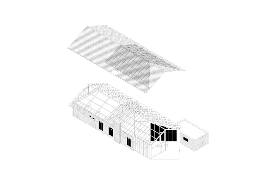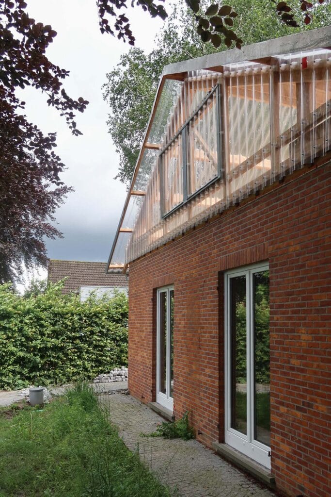 Voor de renovatie van het dak behouden we enkel de bestaande dakspanten. De rest van de dakopbouw wordt afgebroken. Het schilddak wordt omgevormd tot een zadeldak door een minimale aanvulling van een houten balkenstructuur op de hoeken. Door de dakspanten te bekleden met polycarbonaatplaten beogen we om op het beschermd volume een wintertuin te creëren. Het zadeldak wordt dus niet geïsoleerd noch verwarmd. Wat voordien zoldervoer was, wordt geïsoleerd volgens comforteisen van een plat dak. Daarnaast bevindt zich in de wintertuin een vrijstaand geïsoleerd volume. Een deel van dit volume doet dienst als slaapkamer. Het andere deel creëert een dubbelhoge leefruimte op het gelijkvloers.