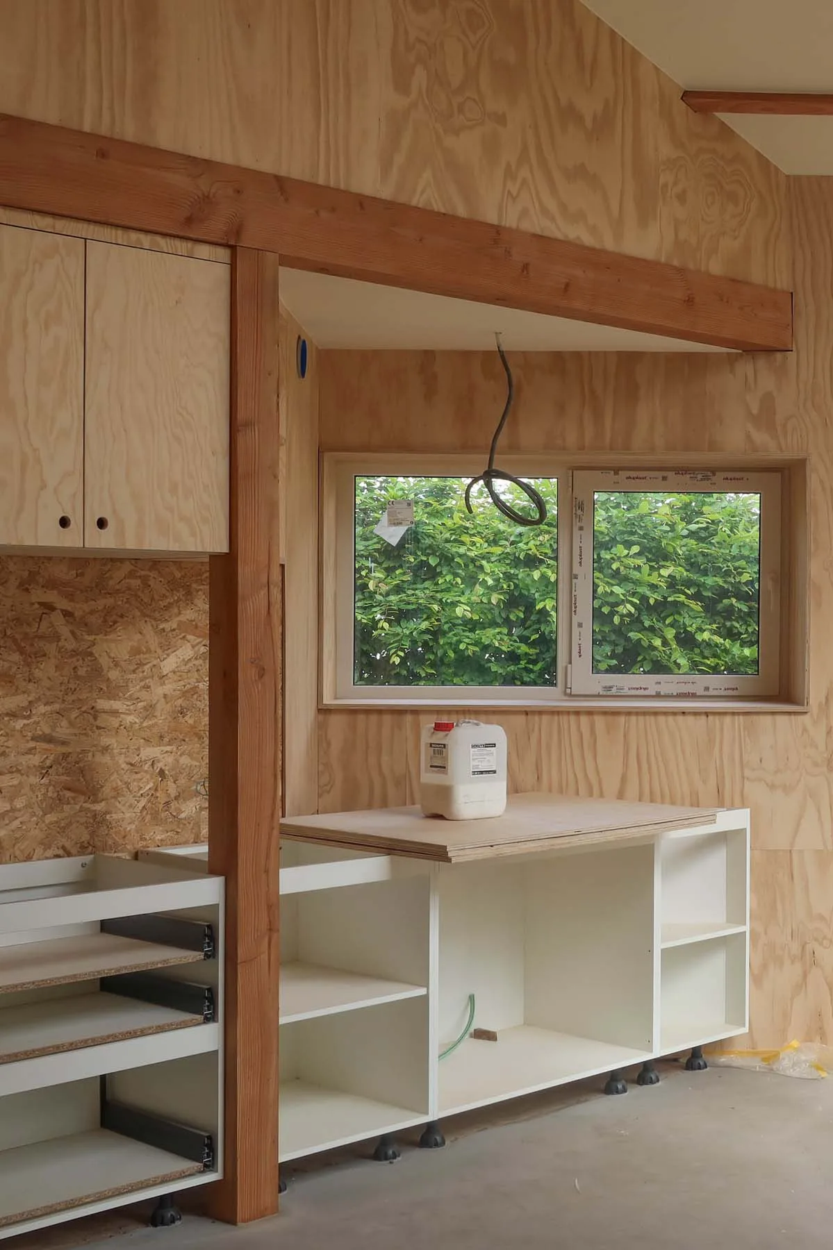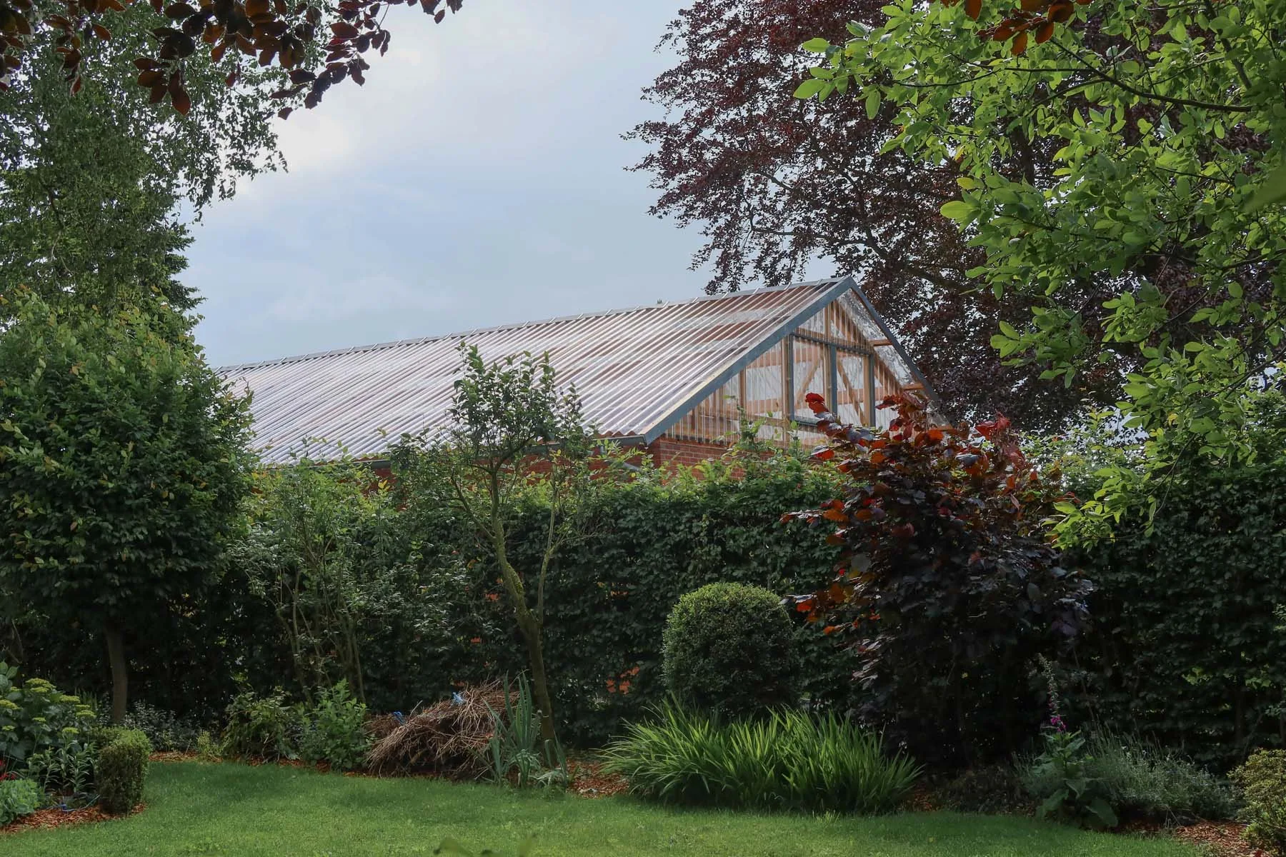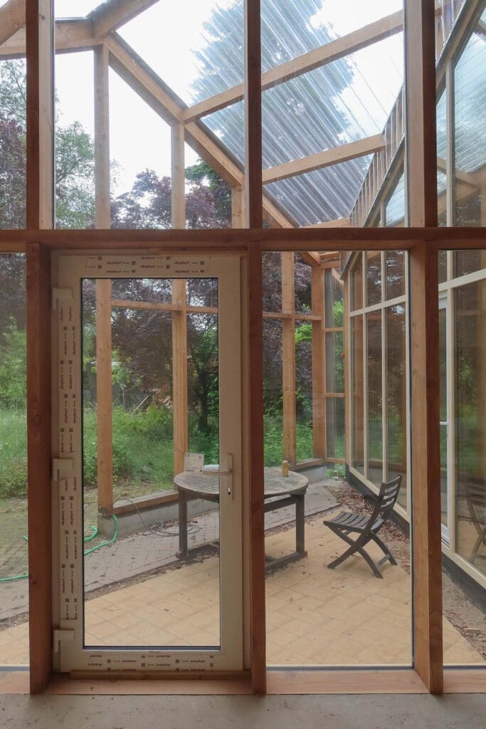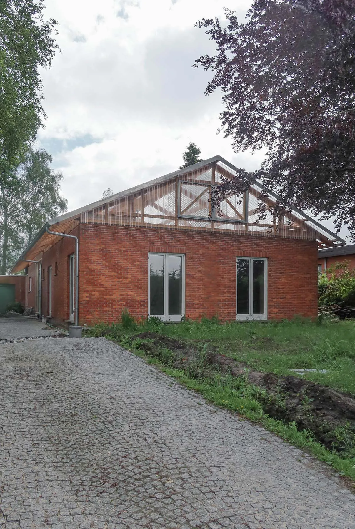 Voor de renovatie van het dak behouden we enkel de bestaande dakspanten. De rest van de dakopbouw wordt afgebroken. Het schilddak wordt omgevormd tot een zadeldak door een minimale aanvulling van een houten balkenstructuur op de hoeken. Door de dakspanten te bekleden met polycarbonaatplaten beogen we om op het beschermd volume een wintertuin te creëren. Het zadeldak wordt dus niet geïsoleerd noch verwarmd. Wat voordien zoldervoer was, wordt geïsoleerd volgens comforteisen van een plat dak. Daarnaast bevindt zich in de wintertuin een vrijstaand geïsoleerd volume. Een deel van dit volume doet dienst als slaapkamer. Het andere deel creëert een dubbelhoge leefruimte op het gelijkvloers.