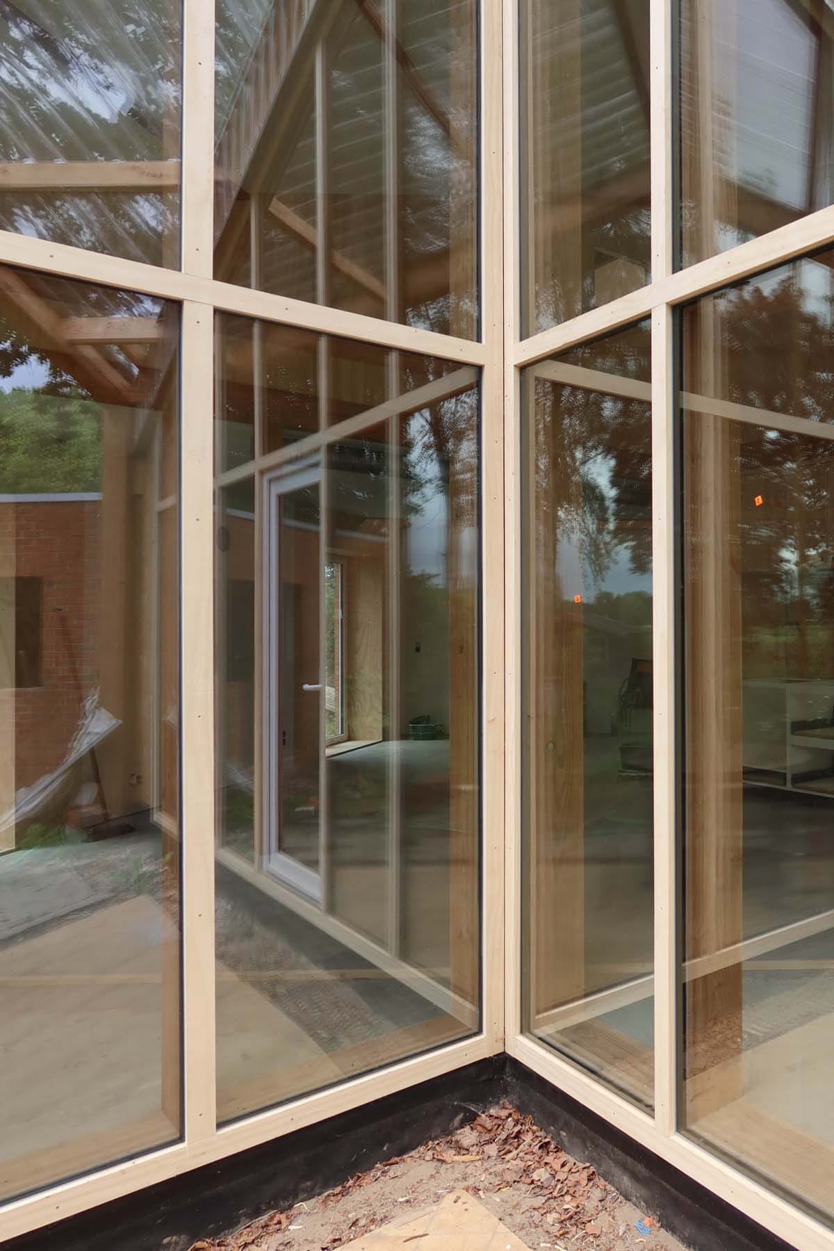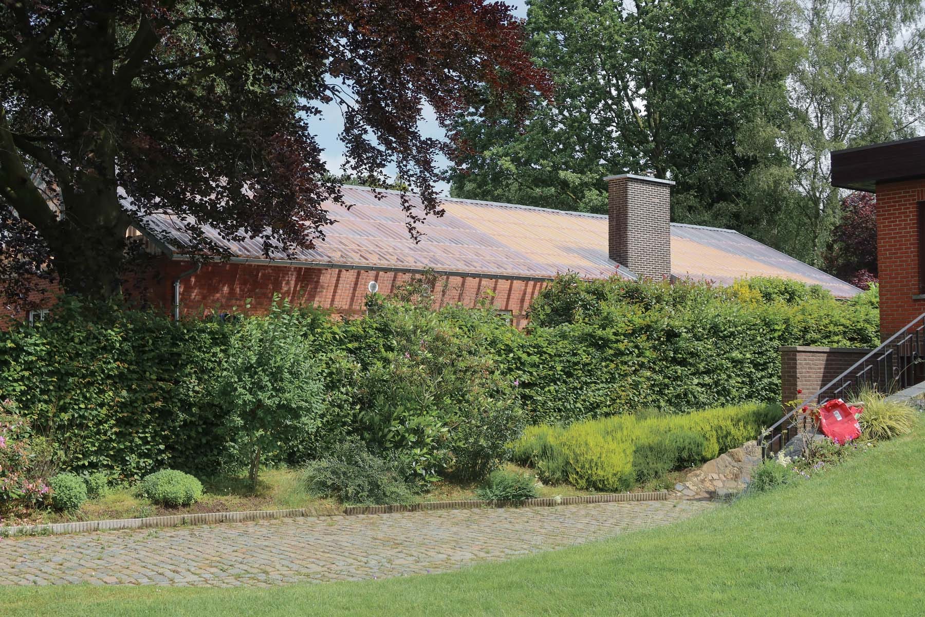 De hoofdbouw heeft een goede massieve baksteen draagstructuur voor de buitenmuren, en een kwalitatieve houten spantenstructuur voor het dak. Deze structuren worden maximaal behouden en dus beperkt aangepast met enkele functionele wijzigingen. Gezien de kwalitatieve baksteen draagstructuur en de karaktervolle rode baksteen façade hebben we gekozen om de woning van binnenuit te isoleren. De perimeter van het gebouw blijft behouden. Om het gebouw optimaal te kunnen afstellen op de eisen van de nieuwe bewoner, maar voornamelijk om koudebruggen te vermijden worden alle binnenmuren weggehaald. Waarna de ruimte opnieuw kan worden onderverdeeld met een lichte structuur. Voor dezelfde reden wordt de bestaande vloer behouden en een nieuwe vloer bovenop geplaatst. Naast het baksteen buitenvolume dat ongewijzigd blijft behouden we ook de raamopeningen. Enkel de inham aan de inkom en de openingen in de achtergevel worden gewijzigd. We breken de inham van de inkom af en plaatsen een glasvliesgevel op dezelfde lijn van de façade. Om de connectie met de tuin te optimaliseren, breken we ook de baksteengevel in het oosten af en vervangen deze door een open lichtrijke glasvliesgevel. Er wordt verharding voorzien aan de achterzijde van het huis om de verbinding te maken tussen de woning en de garage. We integreren de infrastructuur met de groene omgeving.