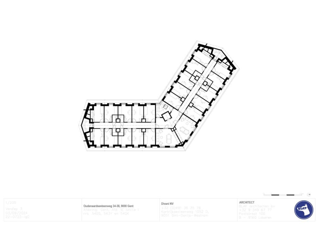 - Het hoekgebouw bestaat uit twee vleugels (één aan de Oudenaardsesteenweg en één aan de Jockeystraat), die als gevolg van de stompe straathoek een boemerang-figuur maken. In de binnenhoek (tuinzijde) van die figuur bevindt zich de centrale circulatiekern (trappenhuis + lift). In de buitenhoek (straatzijde) bevinden zich de leefkeukens die rechtstreeks bereikbaar zijn vanuit de centrale circulatie (de zogenaamde ‘luide circulatie’), alsook de toegang tot het gebouw op het gelijkvloers. Beide vleugels hebben een planopbouw met een centrale gang (de zogenaamde ‘stille circulatie’) met kamers aan beide zijden. De gangen geven ter hoogte van de kopgevels van het gebouw uit op vluchttrappen, die binnen de bouwenveloppe van het gebouw vervat zitten. Iedere vleugel bevat 10 studentenkamers en één leefkeuken, iedere verdieping bevat bijgevolg 20 kamers en twee leefkeukens. Op het gelijkvloers is slechts één groep van 9 kamers met leefkeuken voorzien. Één kamer werd ingeruild voor een rolstoeltoegankelijk sanitair en een technisch lokaal. Alle kamers en leefkeukens in het gebouw zijn integraal toegankelijk bereikbaar.