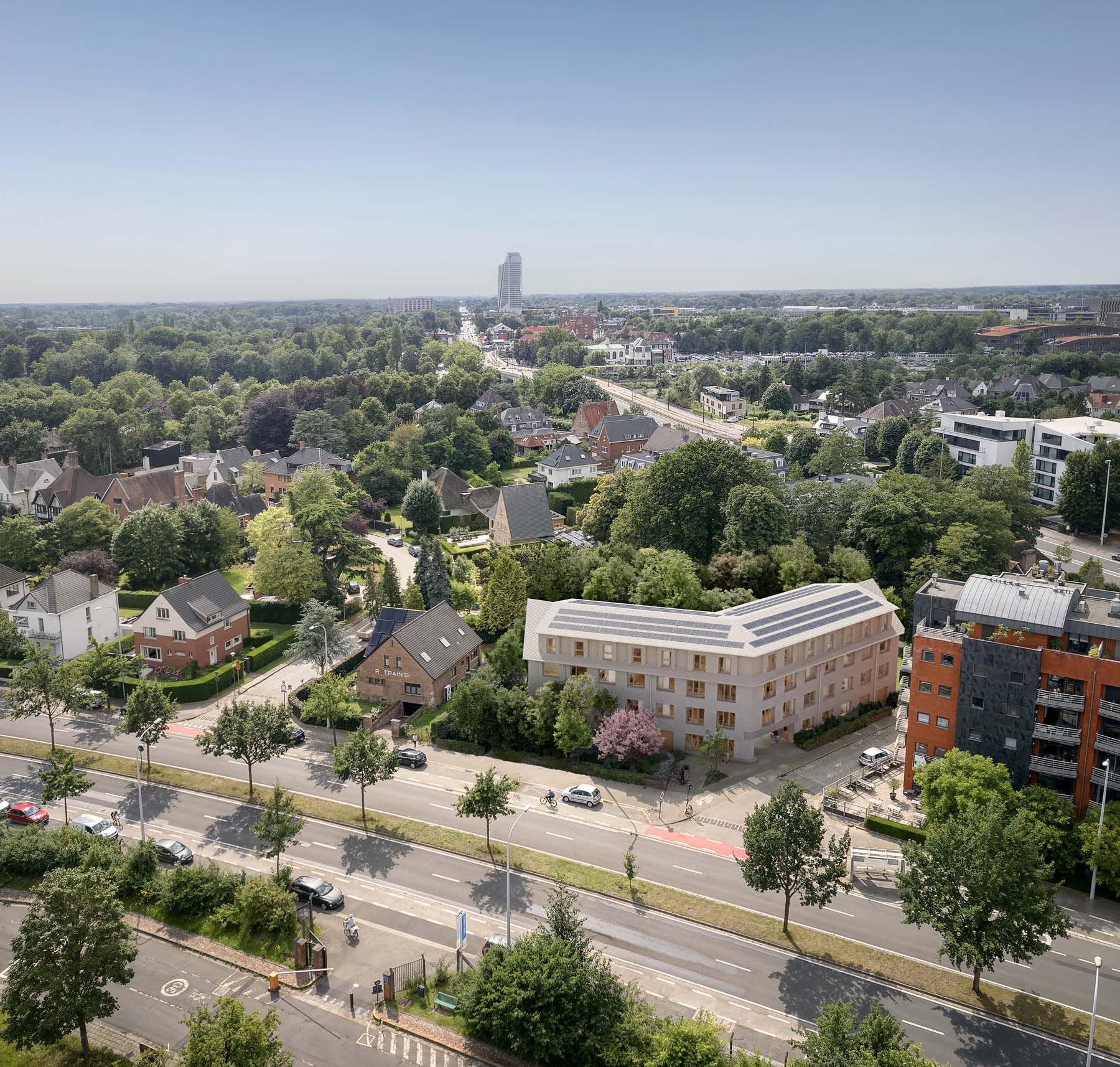 - Het gebouw moet mediëren tussen de schaal van de steenweg, de villa’s van Quartier du Sterre, en de bebouwing in de Jockeystraat. Het project verschijnt daarom als een groot vrijstaand hoekhuis met 3 bouwlagen en een bewoonbare dakverdieping, in een heldere, compacte en herkenbare morfologie. De mogelijkheid om aan de Oudenaardsesteenweg 4 volwaardige bouwlagen te realiseren wordt bijgevolg niet benut.