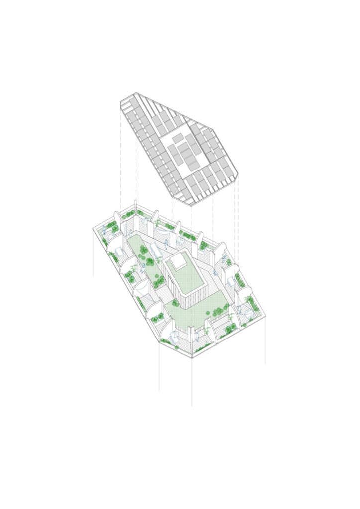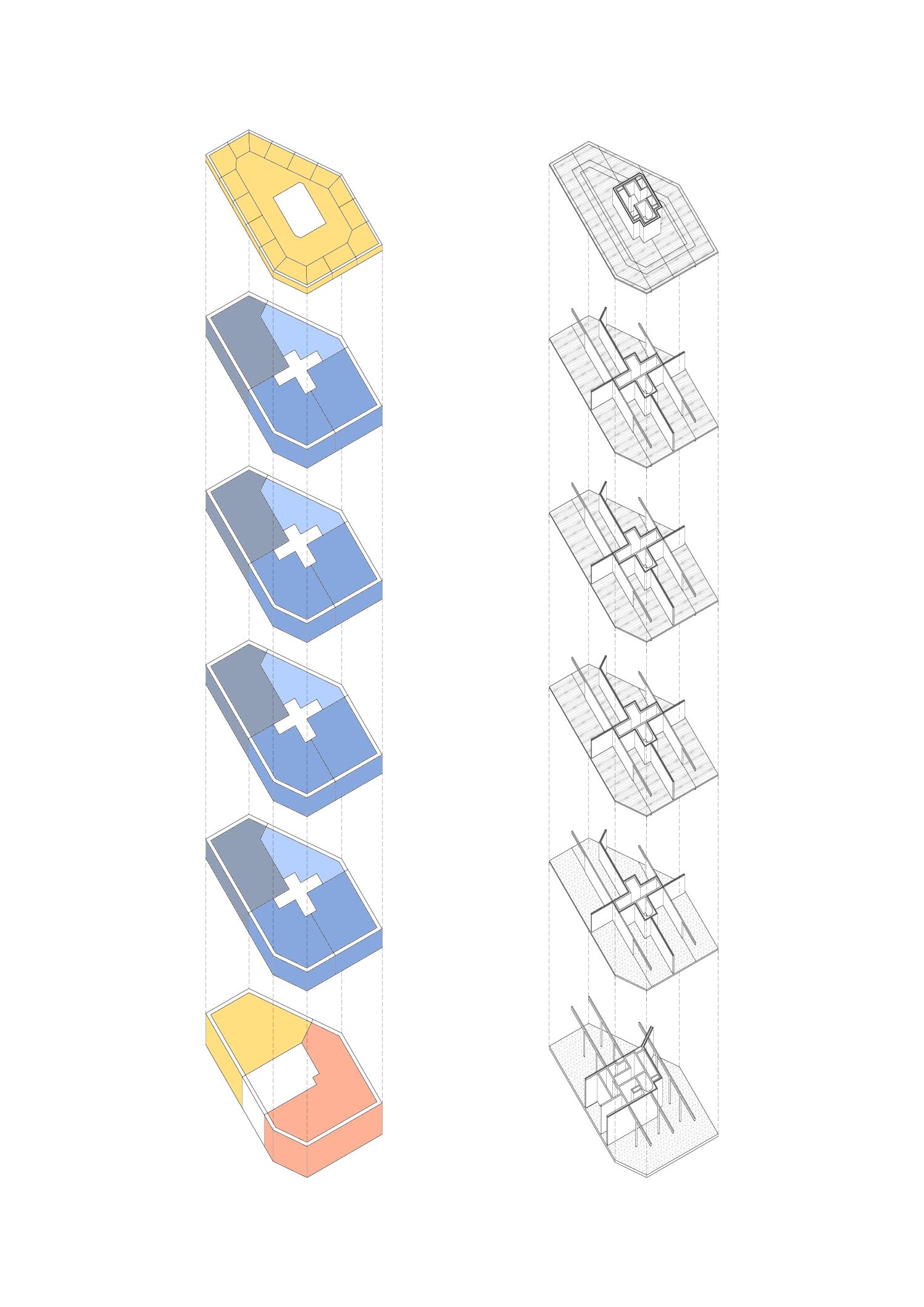 Het gebouw telt vijf bouwlagen: vier woonverdiepingen bovenop een robuuste plint met een niet-residentiële, buurtversterkende invulling. De eenvoudige volumetrie volgt strikt de bouwcontouren en resulteert in een rationeel, kostenbewust ontwerp met een uitgesproken stedelijke uitstraling. De afgeschuinde hoek versterkt de leesbaarheid van het volume en markeert de overgang tussen de omliggende bouwvelden.