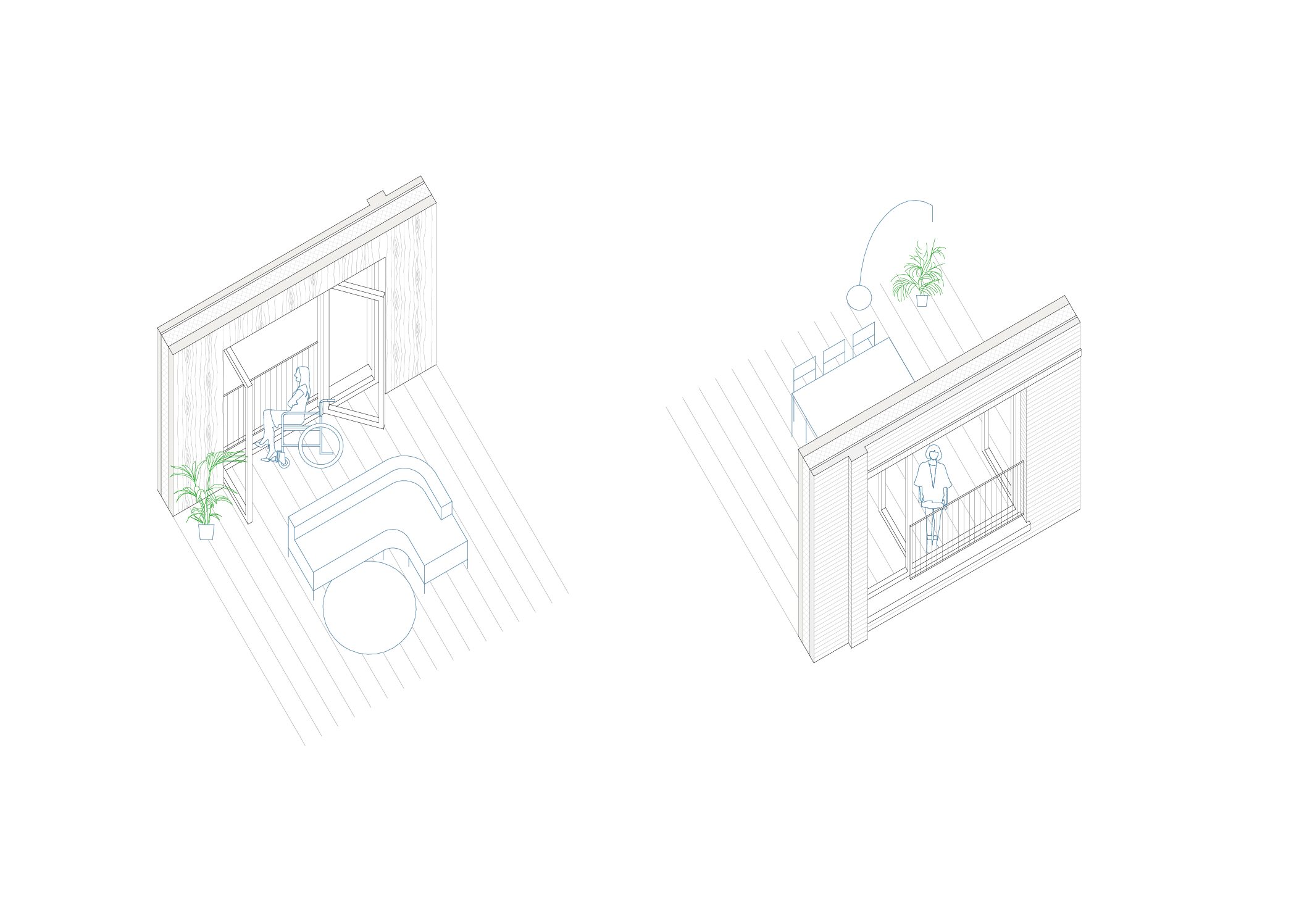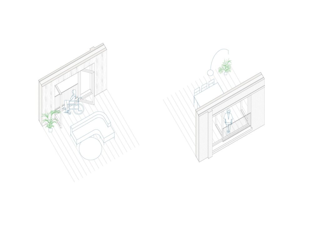 De materialisatie in baksteen sluit aan bij de typologie van stedelijke kaaigebouwen en zorgt voor een ingetogen maar robuuste architectuur. Een hoge plint maakt de overgang tussen wonen en openbare ruimte leesbaar en versterkt de interactie met de omgeving.